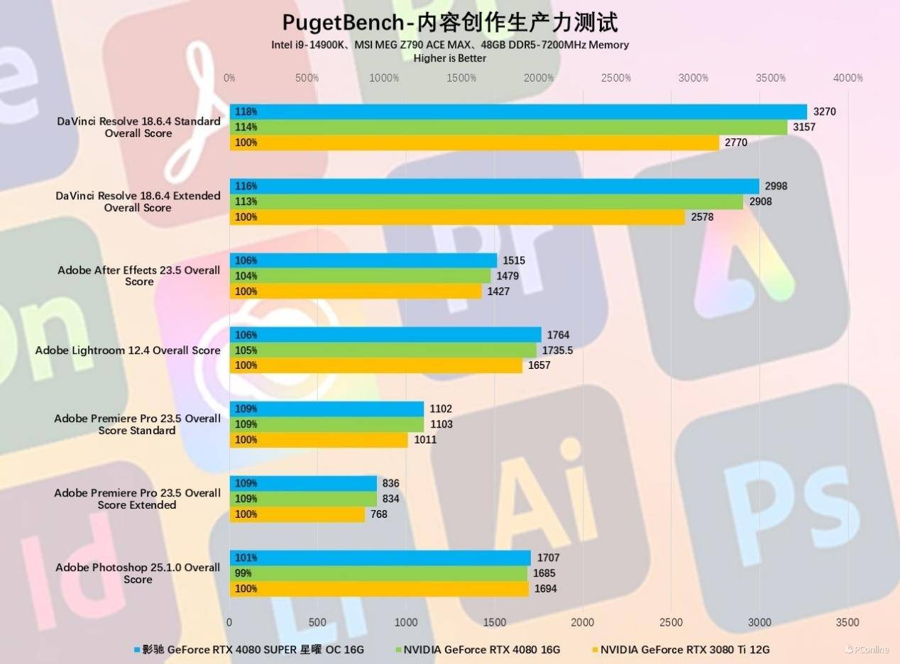在Adobe或达芬奇等软件的Benchmark中,影驰RTX 4080 SUPER星曜OC也和前面测试类似,整体强于RTX 3080 Ti,特别是在达芬奇里,因为有了AVI编解码的支持,新显卡的性能相比RTX 3080 Ti足足提升了近20%,换装新显卡无疑能够大幅提升你的工作效率!。