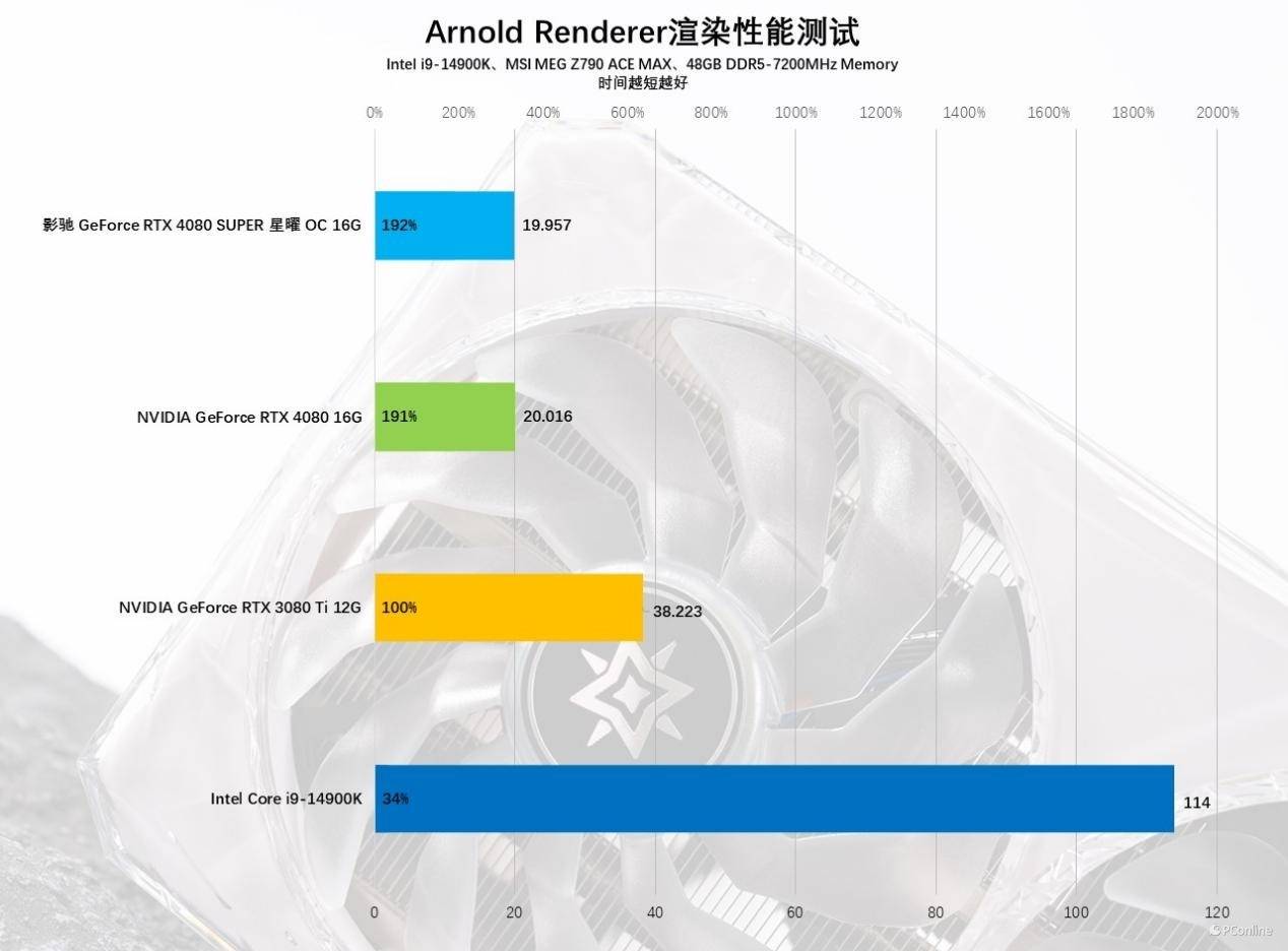再看看加入了光线追踪的渲染器,Arnold渲染器。在这个软件里,影驰RTX 4080 SUPER星曜OC更是离谱,直接就是翻倍的性能提升,RTX 3080 Ti需要38秒渲染的项目,影驰RTX 4080 SUPER星曜OC只用19秒,比RTX 4080还要快一点。