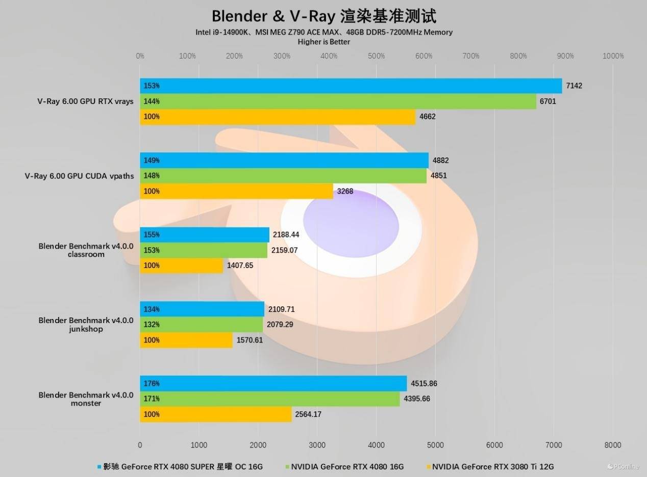 总体来看,视频生产力方面的性能,由于压力不算大,所以领先不是特别明显。不过在压力更大的渲染场景就不一样了,在Blender和V-Ray渲染软件中,影驰RTX 4080 SUPER星曜OC对比RTX 3080 Ti平均提升来到了50%以上,表现相当亮眼。跟RTX 4080比的话,差距就比较小了,不过看看它的售价,更低的价格更高的性能,其实还是不错的。
