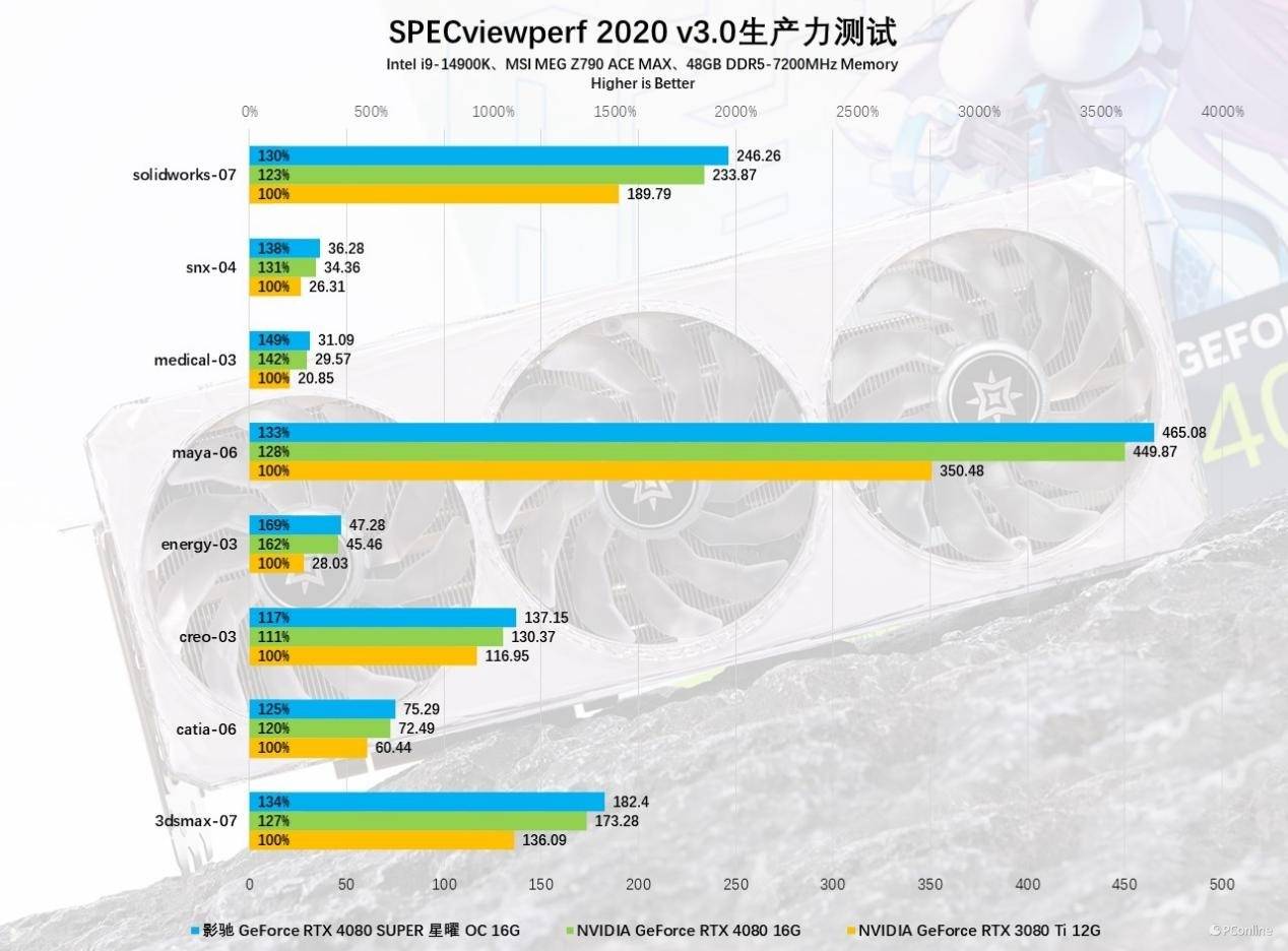 而在专业软件合集SPEC 2020中,影驰RTX 4080 SUPER星曜OC也是傲视群雄,对比RTX 3080 Ti平均也有40%的提升,妥妥的工业应用利器。