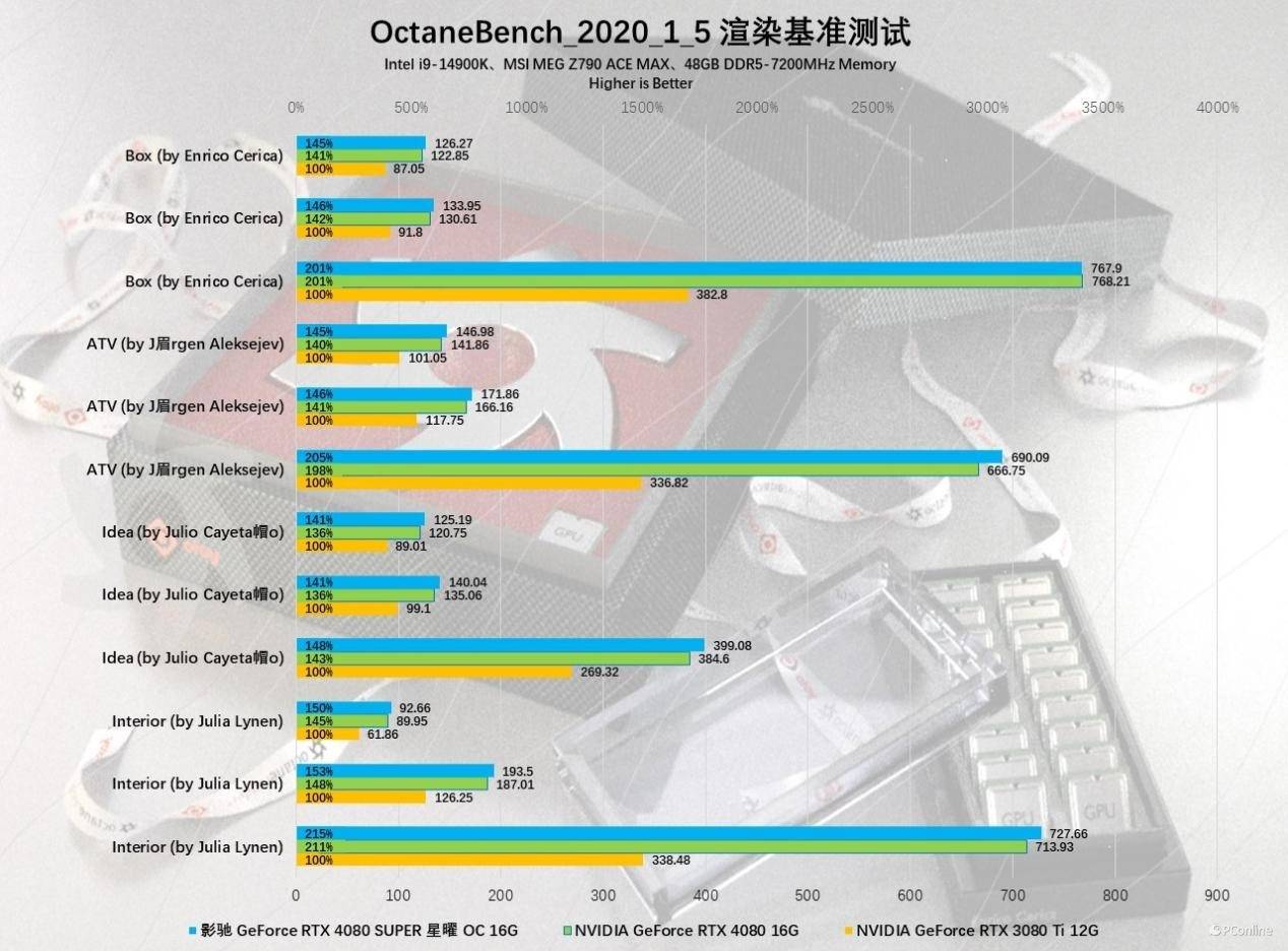 不过工业领域提升更大的还得看OC渲染器,大部分测试项目的表现要比RTX 3080 Ti高了50%以上,甚至有些已经是2倍以上的涨幅了。对比RTX 4080的话,性能差距则在5%左右,符合正常预期。