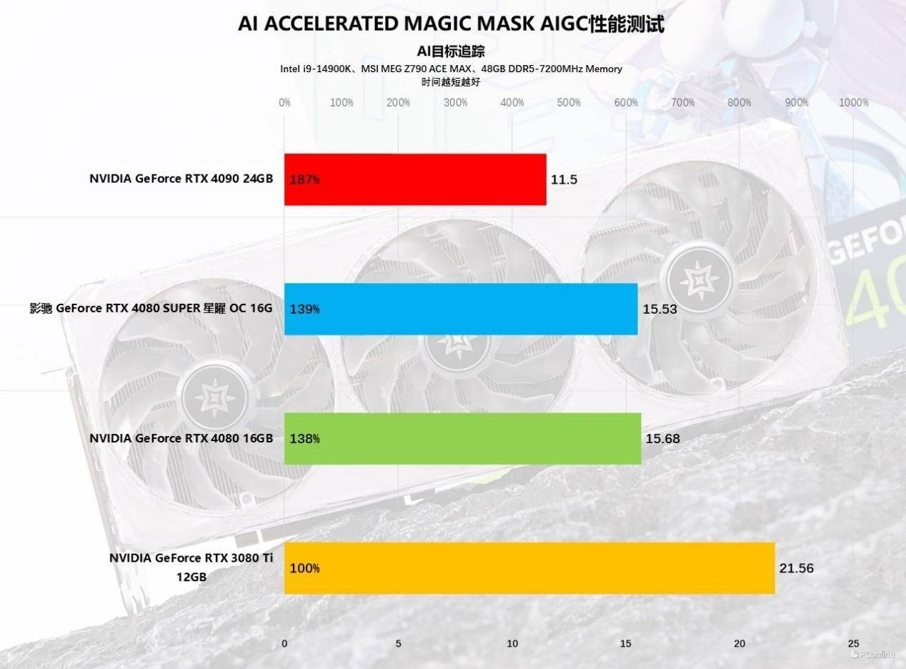 再看看AI的另一个应用,就是在达芬奇剪辑软件里可以利用RTX 40系显卡的神经网络引擎进行目标追踪。在AI ACCELERATED MAGIC MASK测试里,影驰RTX 4080 SUPER星曜OC的完成时间为15.5秒,与RTX 4080差不多。但是跟RTX 3080 Ti比,那就是降维打击了,后者需要21秒的时间,单从效率上来看,影驰RTX 4080 SUPER星曜OC基本比前代显卡快一半左右。