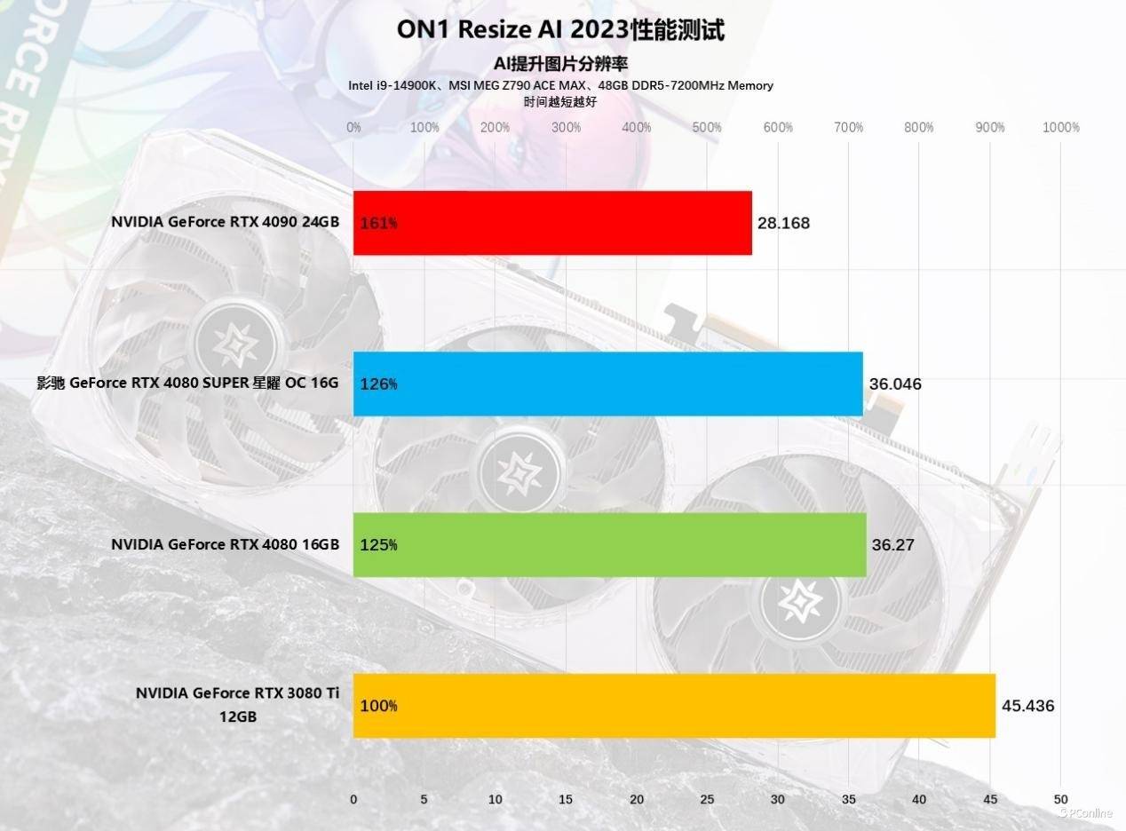 下面是基础的AI能力测试,我们也是使用ON1 Resize AI 2023将5张图片提升200%分辨率,此时影驰RTX 4080 SUPER星曜OC的速度为平均7.2秒一张,而上代的RTX 3080 Ti为9秒左右,不过即便是SUPER后缀,其离老大哥RTX 4090还是有不小的差距存在。
