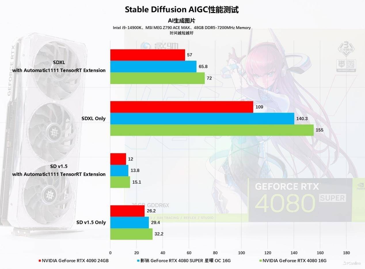 光说没有用,实测就知道了,用SD1.5的模型生成10张512 x 512的图片进行测试,影驰RTX 4080 SUPER星曜OC用时29.4s,相当强势。*PS详细的SD设置为:Sampling Method to: Euler a,Sampling Steps to: 50 ,CFG Scale to: 7,Batch Size to: 1,Batch Count to: 10 。SD1.5模型分辨率为1024*1024;SDXL模型分辨率为512*512。