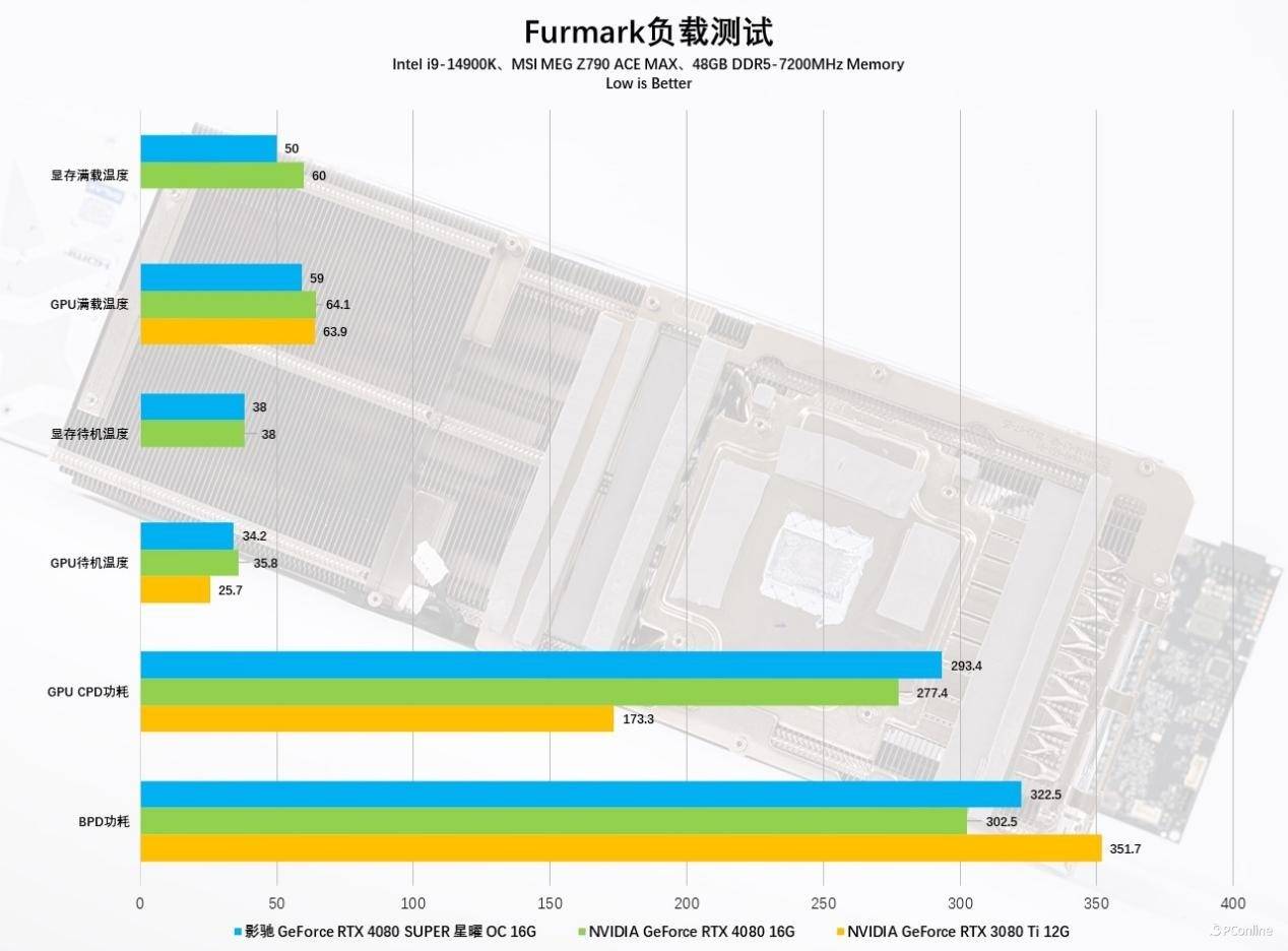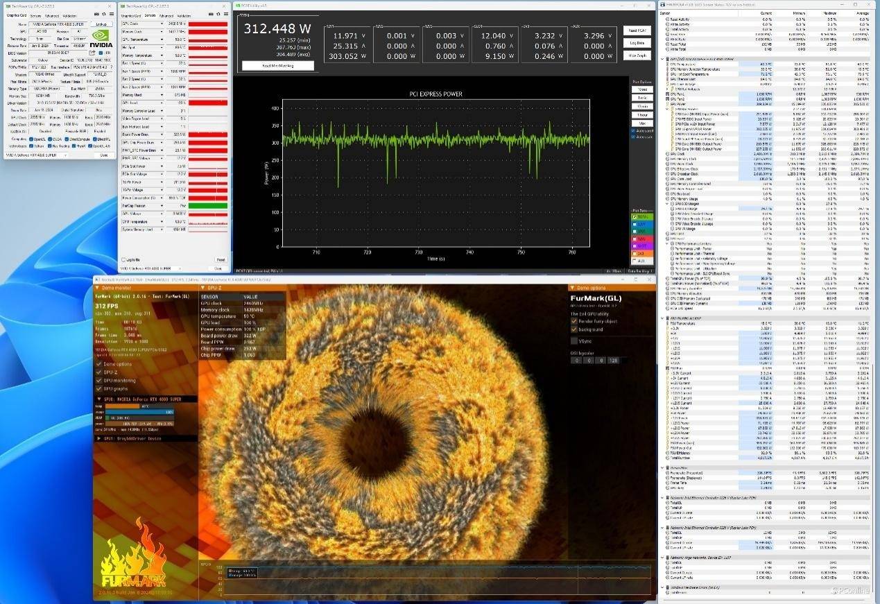 Furmark只能说明显卡在重度负载的情况下功耗表现,我们还使用HWINFO与PCAT工具对显卡对行功耗的监控。从不同的应用软件来看,影驰RTX 4080 SUPER星曜OC的功耗表现基本都是控制在TDP 320W以内。