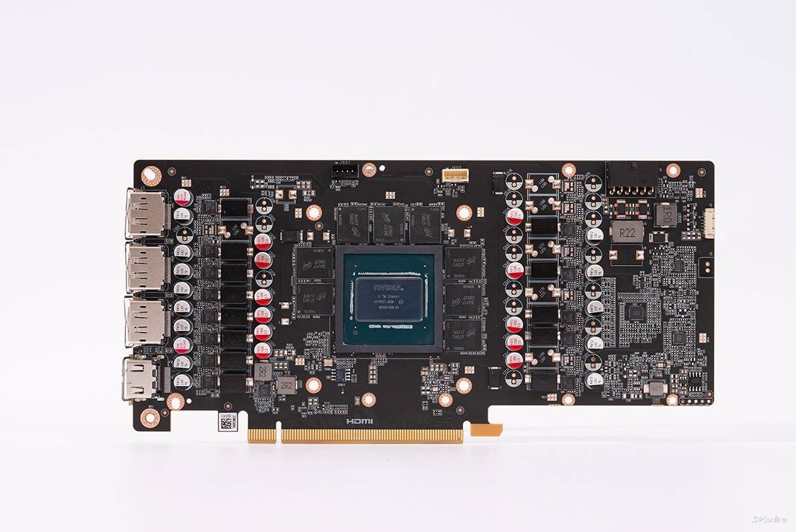 其余部分为加厚、加高的镀镍散热鳍片模组,并且内部还有7根冰脉2.0复合热管,采用精密的无损内嵌焊接工艺,将7根热管均匀分置贯穿整个模组,大大增强了这款显卡的散热效能。