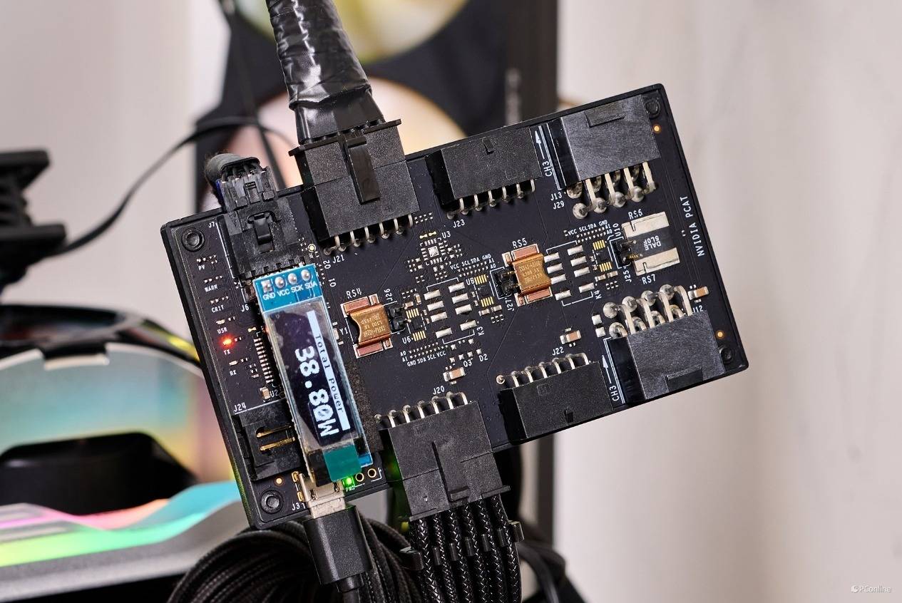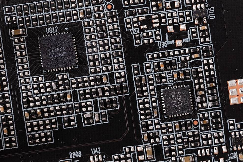PWM供电芯片则被安排在PCB背面,型号为uP9512R和uP9529Q,用于同时管理核心供电金和显存供电。其附近还有一颗名为uS5650Q的芯片,担任电压/电流/功耗监控的工作。