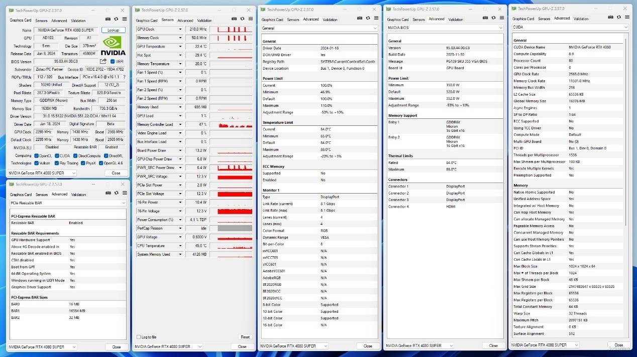 开始测试前,例行检查。在GPU-Z中我们可以看到索泰RTX 4080 SUPER TRINITY OC月白的基准频率为2295MHz,这个频率要比RTX 4080高出90,Boost频率也相当高,直接跃升到2565MHz,比公版的RTX 4080 SUPER要高出60MHz,可见这款显卡在性能上有不小的提升。并且这张显卡的TGP最终落在320W,与公版一致,最高允许突破至450W;88℃的温度墙显然也是为了超频所预留的冗余空间。