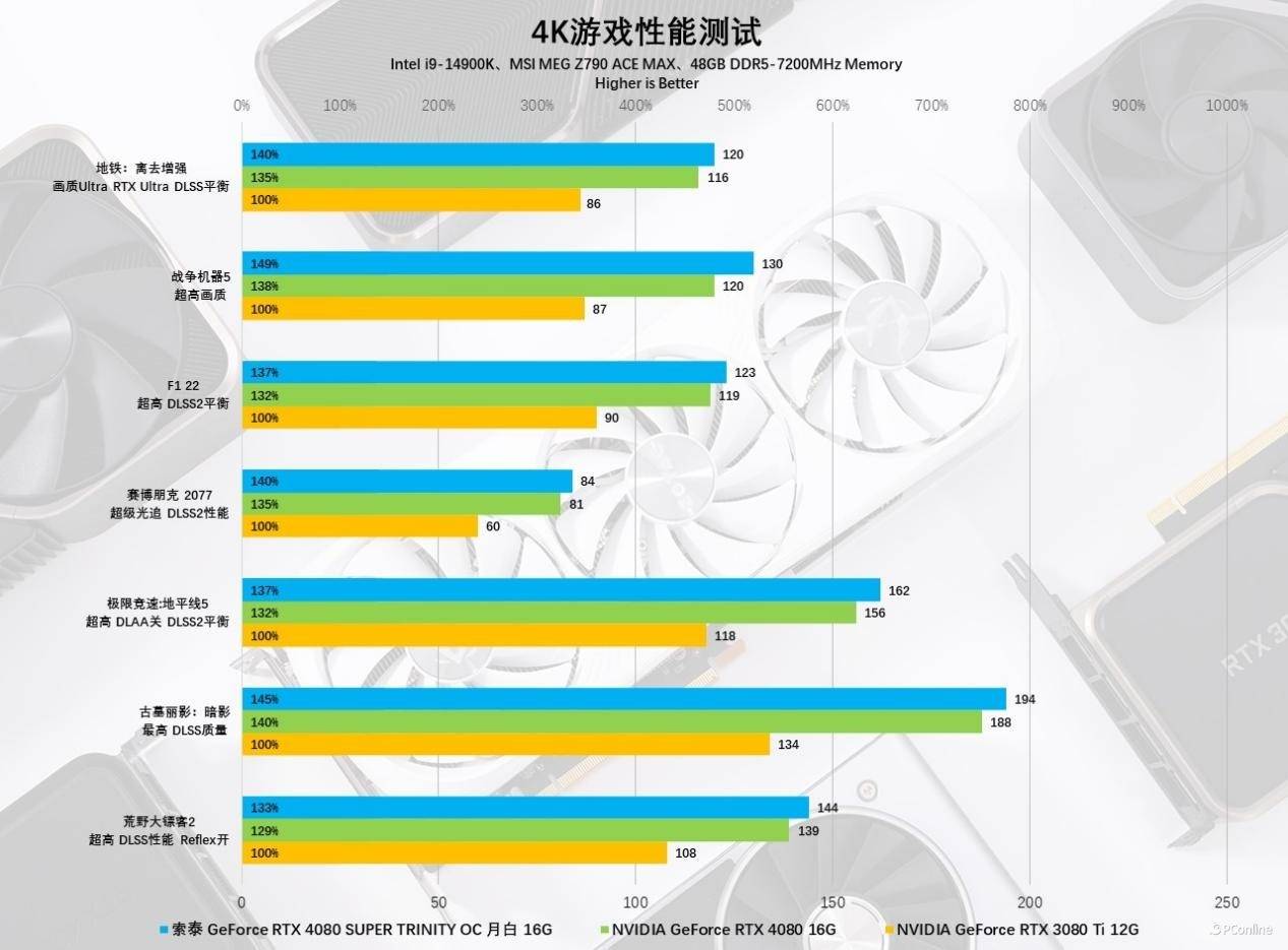 按照惯例,我们也对2K分辨率进行了测试,实测在2K分辨率下,索泰RTX 4080 SUPER TRINITY OC月白开启DLSS 3以后,不少游戏的性能都是RTX 3080 Ti的两倍,就拿《传送门RTX版》来说,前代显卡开了DLSS 2以后能够达到100 FPS,而索泰RTX 4080 SUPER TRINITY OC月白开DLSS 3以后,208 FPS的成绩傲视群雄。