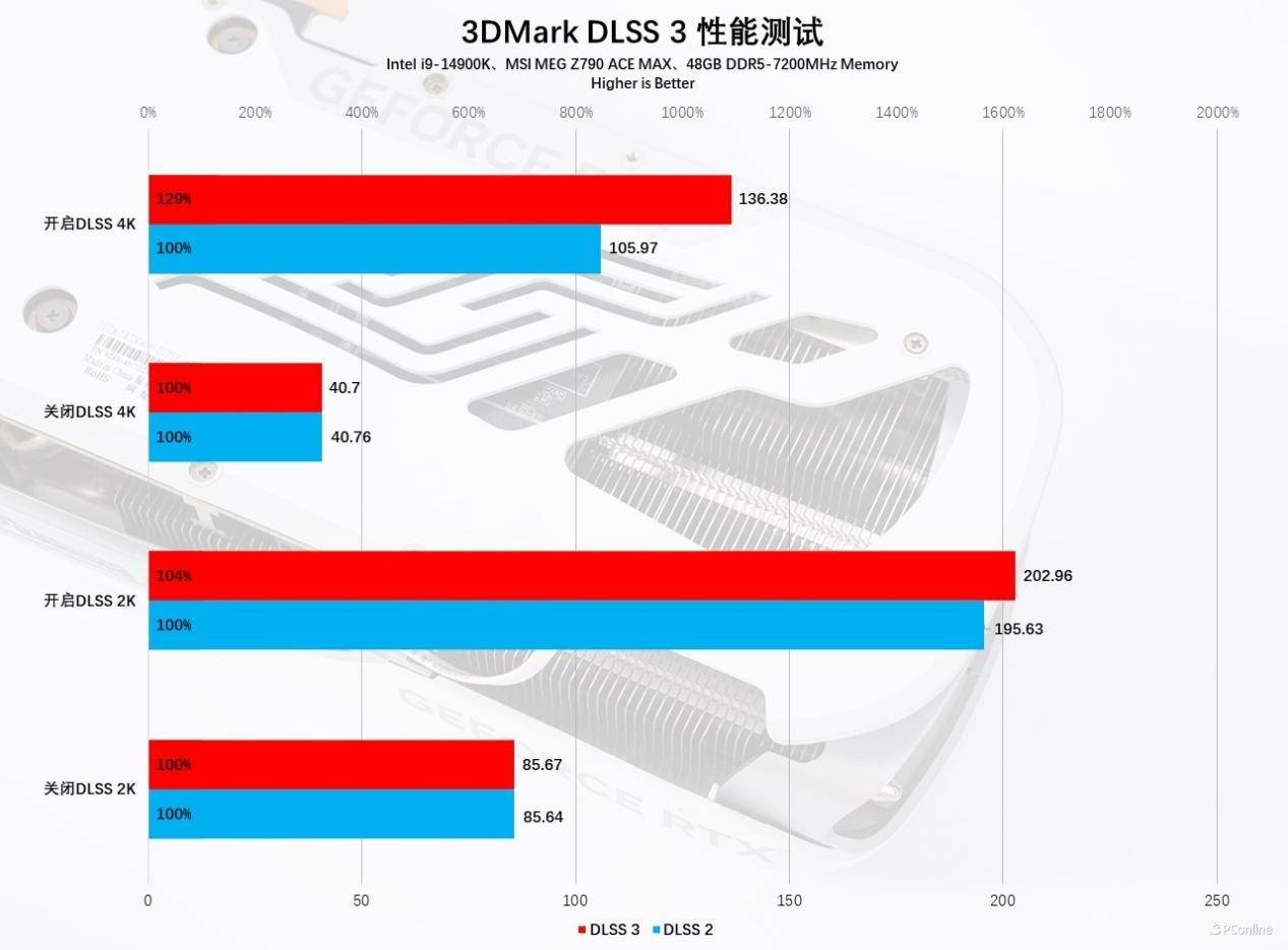 技术可以说相当厉害了,不过要有实际作用才行。先给大家看看3DMark的DLSS 3理论性能测试。实测索泰RTX 4080 SUPER TRINITY OC月白在DLSS 2下,4K只能做到105 FPS,开启DLSS 3后,136 FPS已经接近4K高刷游戏的需求了。2K就更不得了了,202 FPS完全就是超电竞的水准,不过索泰RTX 4080 SUPER TRINITY OC月白的用户应该都是标配4K显示器的,想要高刷4K游戏,买它就对了!