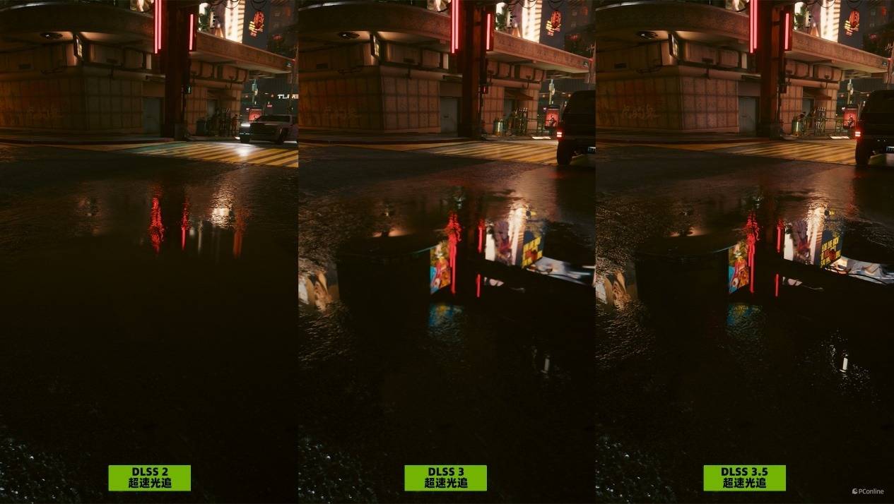 另外《赛博朋克2077》这款游戏也支持了最新的DLSS 3.5,我们也用索泰RTX 4080 SUPER TRINITY OC月白进行了实测。给大家感受一下DLSS 3.5的光线重建技术,打开光线重建后,地面上的倒影比关闭时拥有了更多的细节,建筑和广告牌上的轮廓十分锐利,文字也清晰可辨。在带有反射的场景里面,光线重建都能带来非常惊艳的效果。