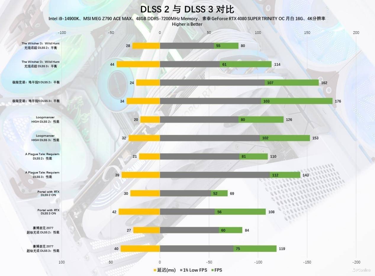 同样的,我们也对比了索泰RTX 4080 SUPER TRINITY OC月白在DLSS 2与DLSS 3下的性能差距,开启DLSS 3后,游戏帧数相比DLSS 2高出20-30帧,并且最重要的一点是,1%Low帧也有不同程度的提升,届时游戏体验也会更加流畅,卡顿掉帧的情况也会比较少见。