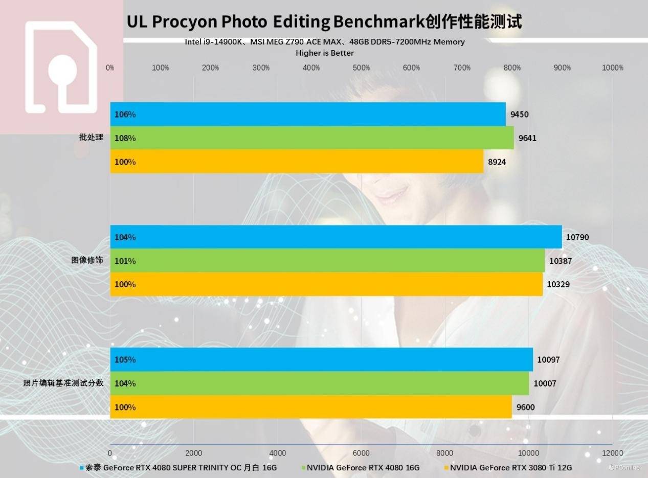 图像编辑也基本差不多,索泰RTX 4080 SUPER TRINITY OC月白的领先幅度在5%左右,与RTX 4080也只是伯仲之间。