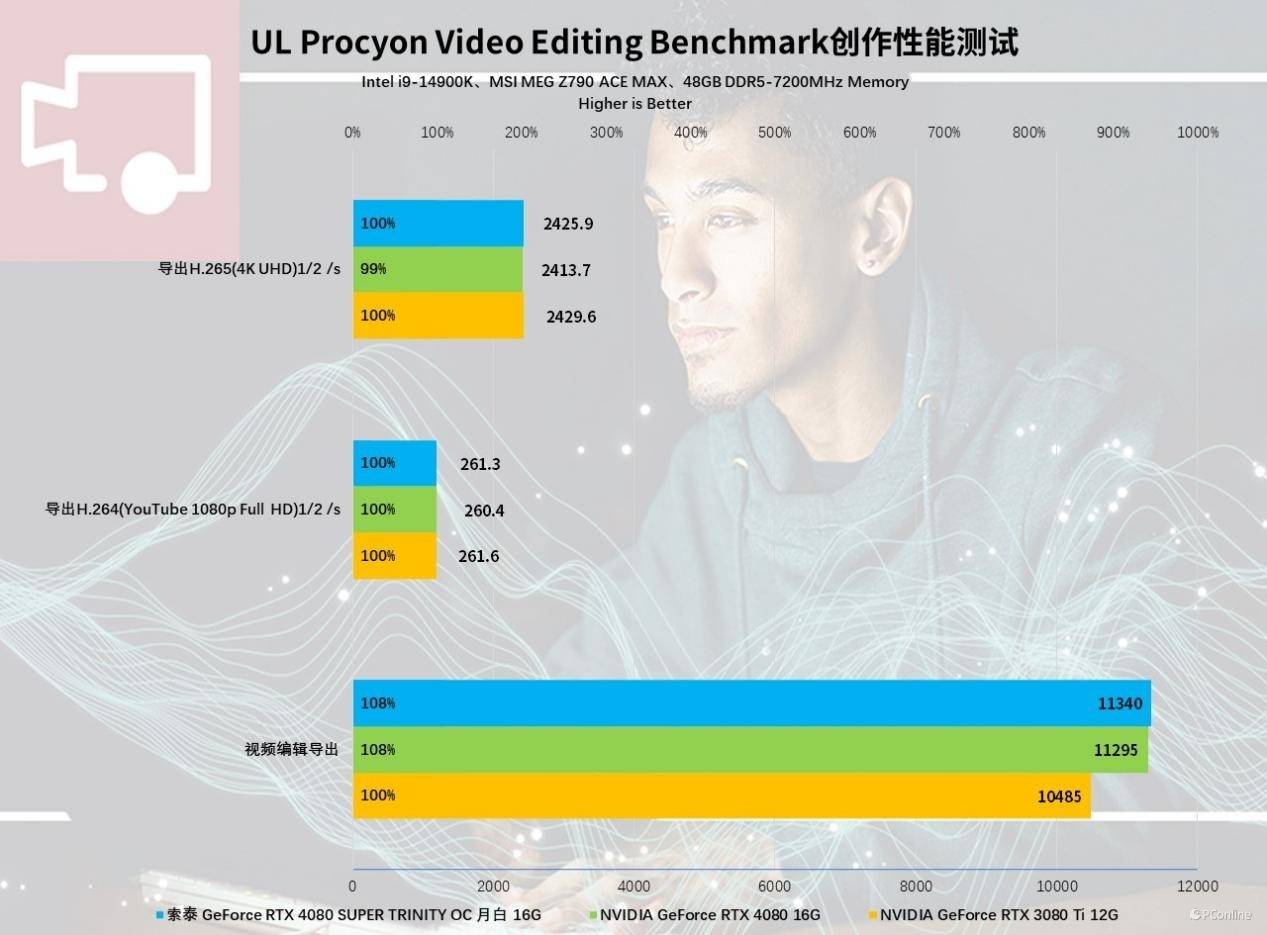 不过视频编辑就比较大压力了,差距被拉大到了8%,并且索泰RTX 4080 SUPER TRINITY OC月白是有新的AV1编解码支持的,这点上30系显卡明显比不了。