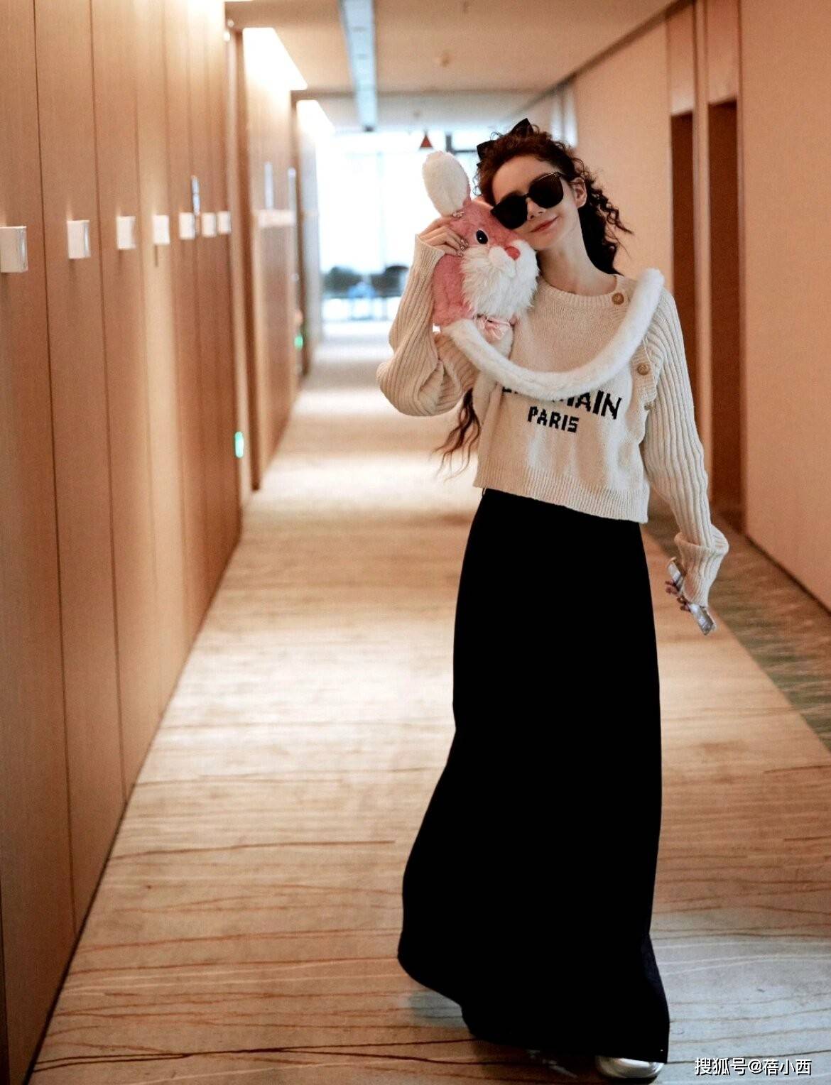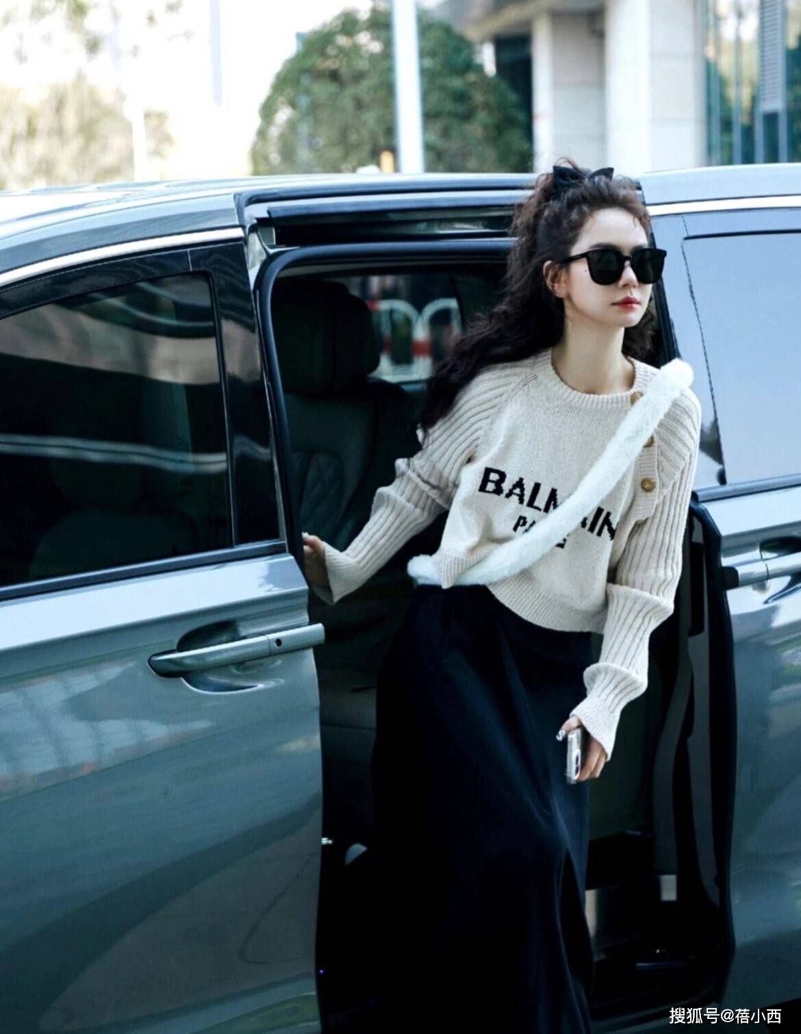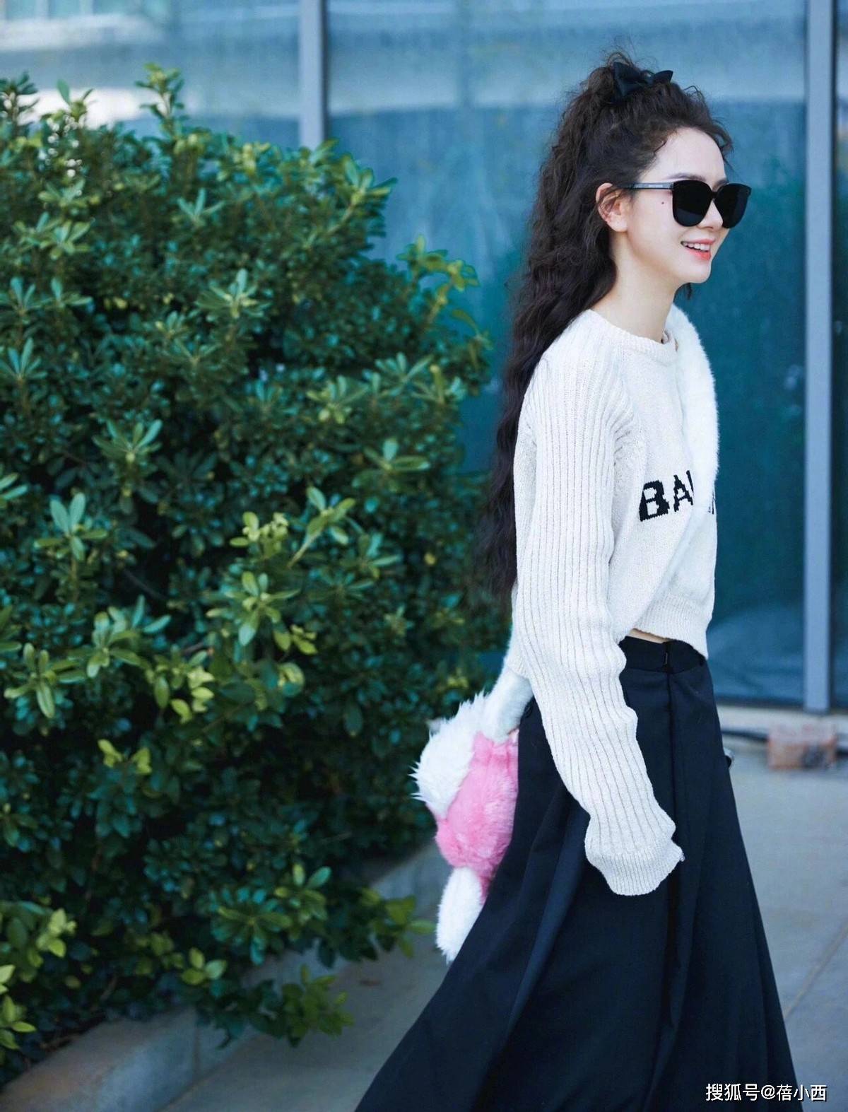 — 戚薇再掀流行:白色毛衣 搭配半身裙与卷发,时髦又有气质 —