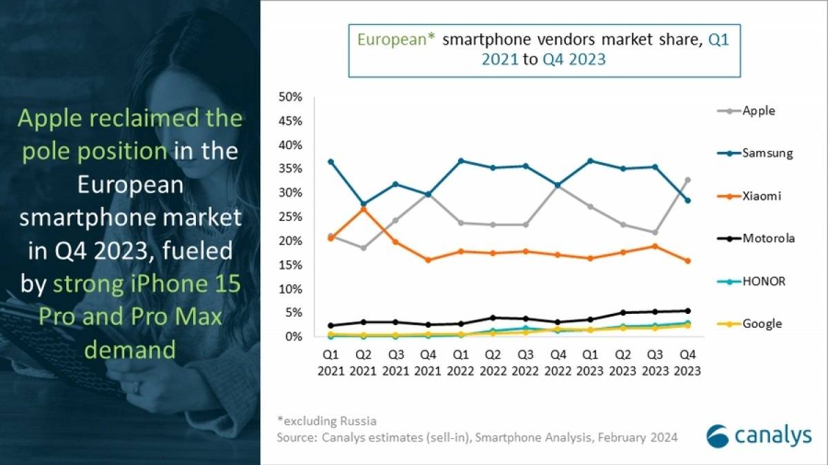 — 2023年第四季度欧洲市场高端智能手机销量再创纪录,苹果仍稳坐霸主位置! —
