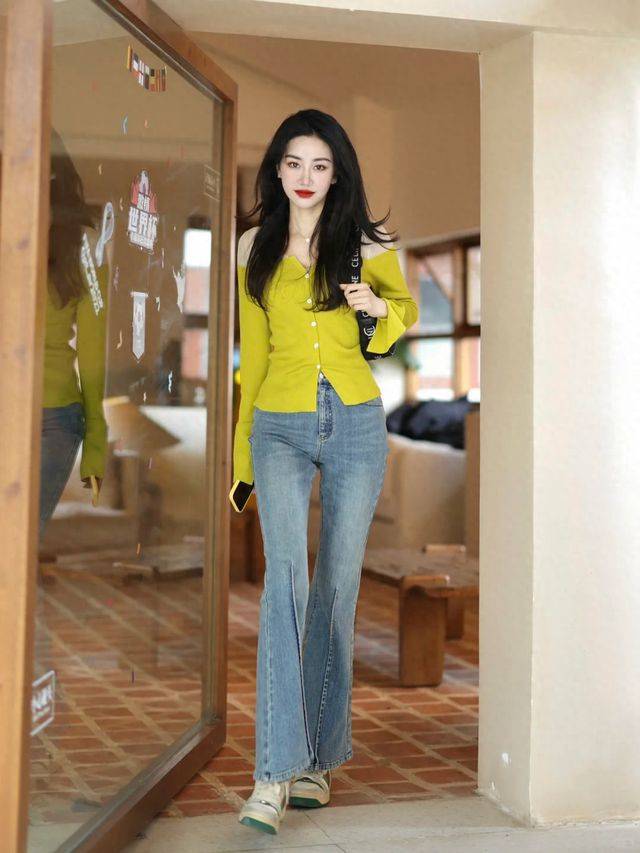 - 街拍:牛仔裤好看又百搭,搭配一字肩上衣很经典,百搭时尚