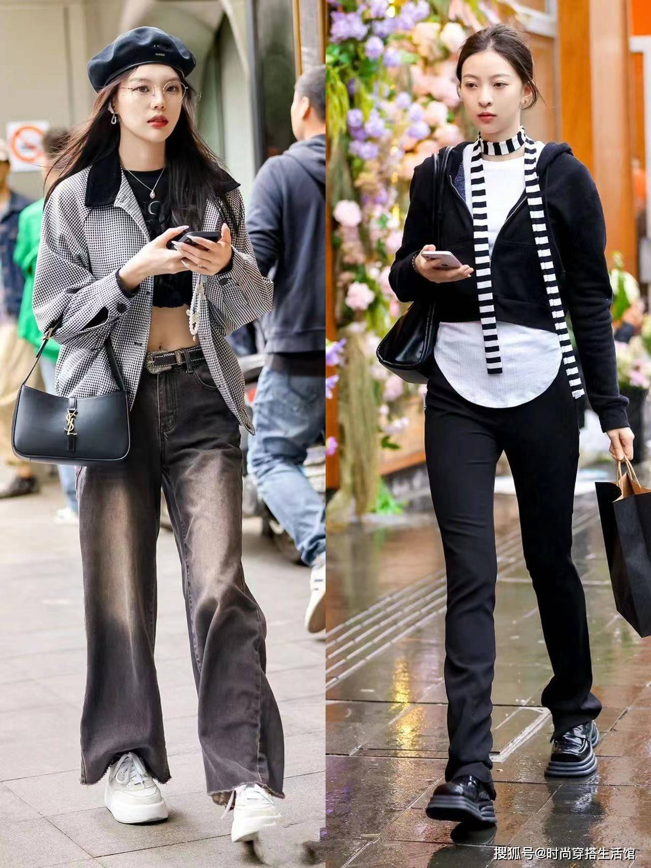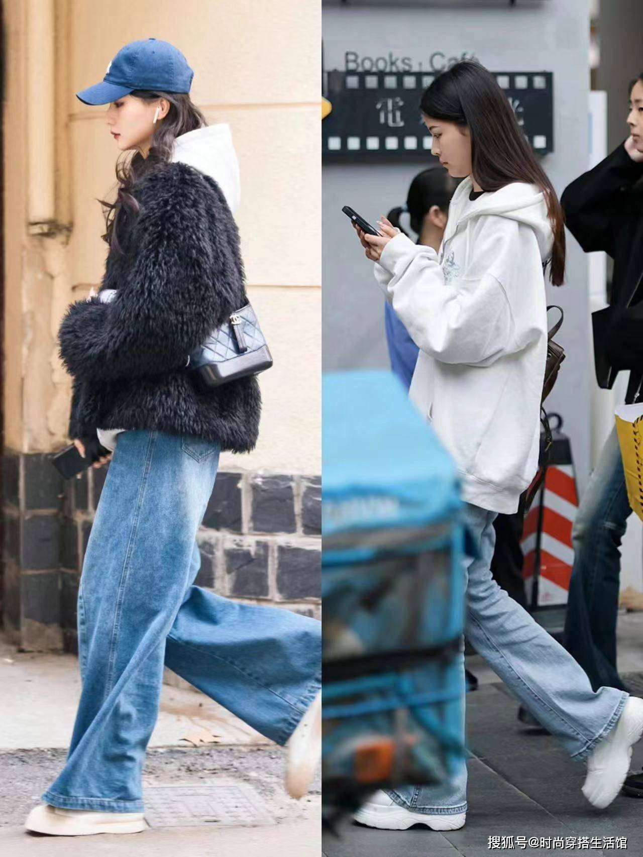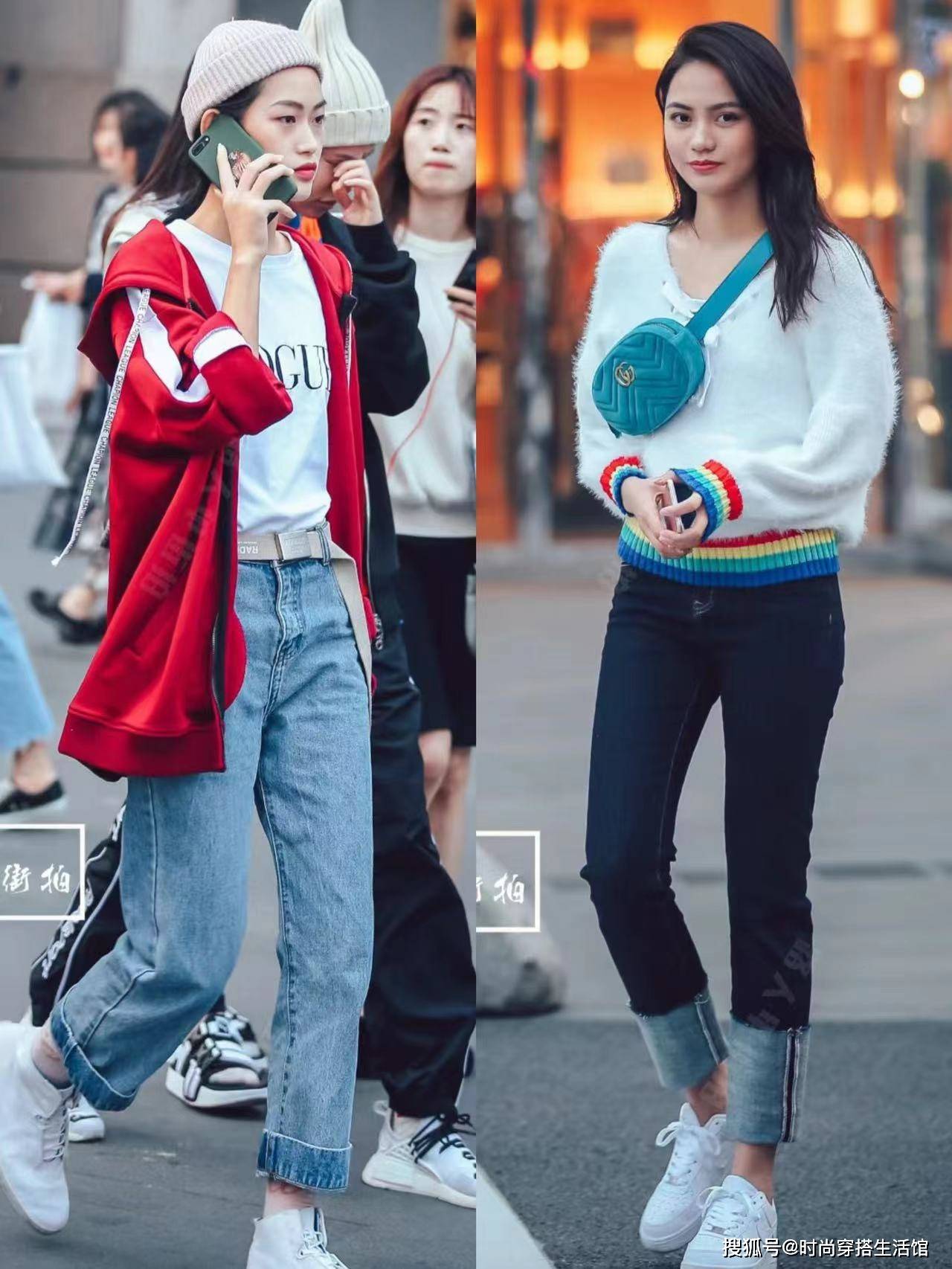 - 街拍:牛仔裤好看又百搭,搭配一字肩上衣很经典,百搭时尚