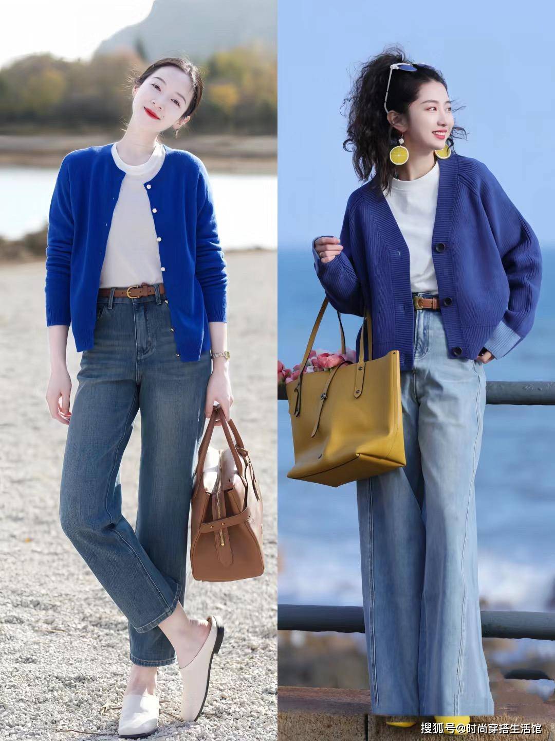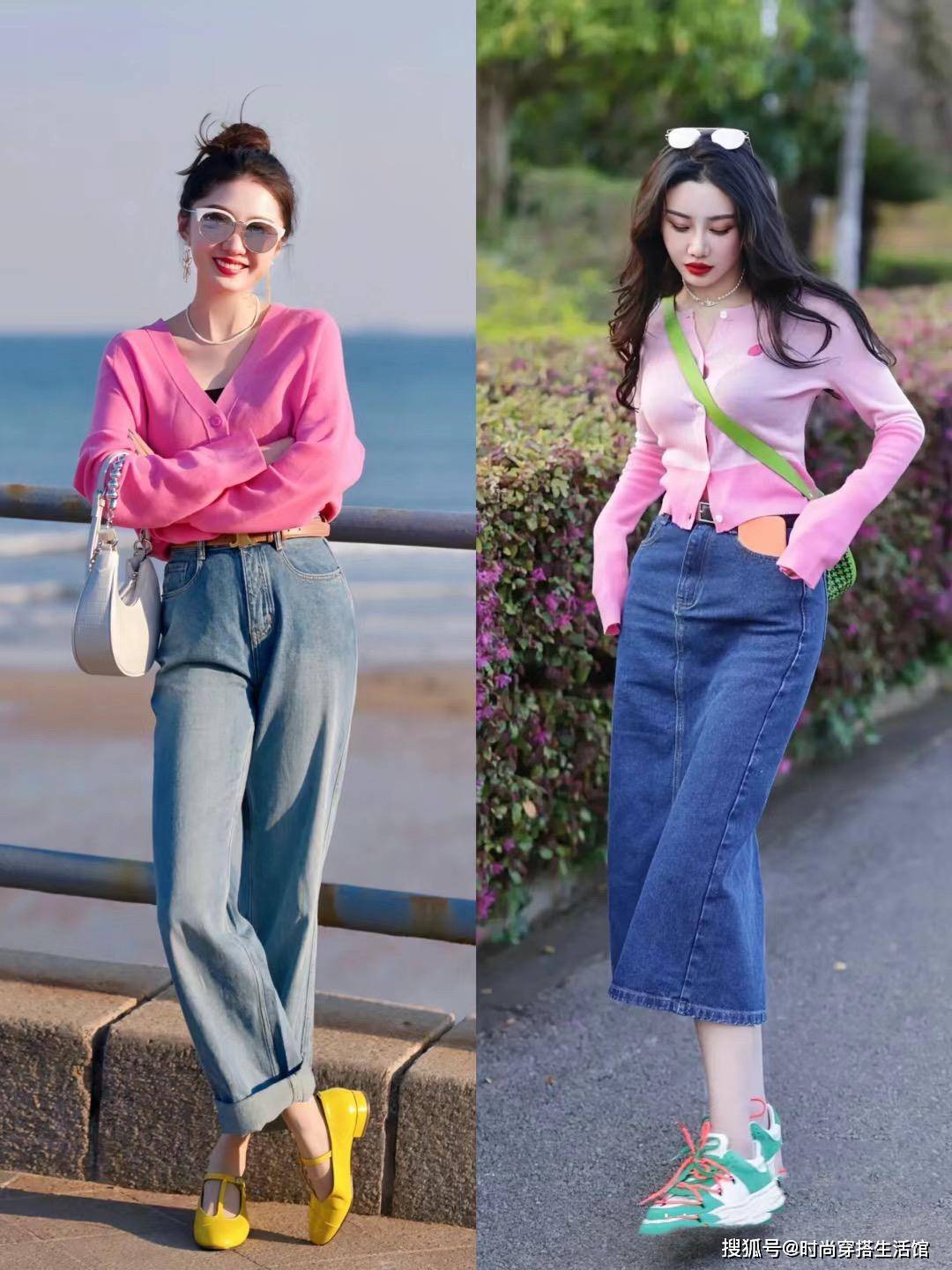 - 街拍:牛仔裤好看又百搭,搭配一字肩上衣很经典,百搭时尚