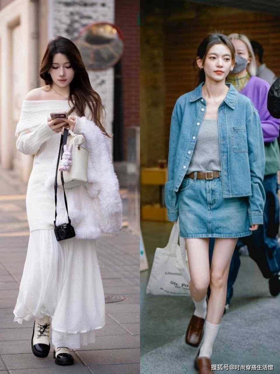 - 街拍:牛仔裤好看又百搭,搭配一字肩上衣很经典,百搭时尚