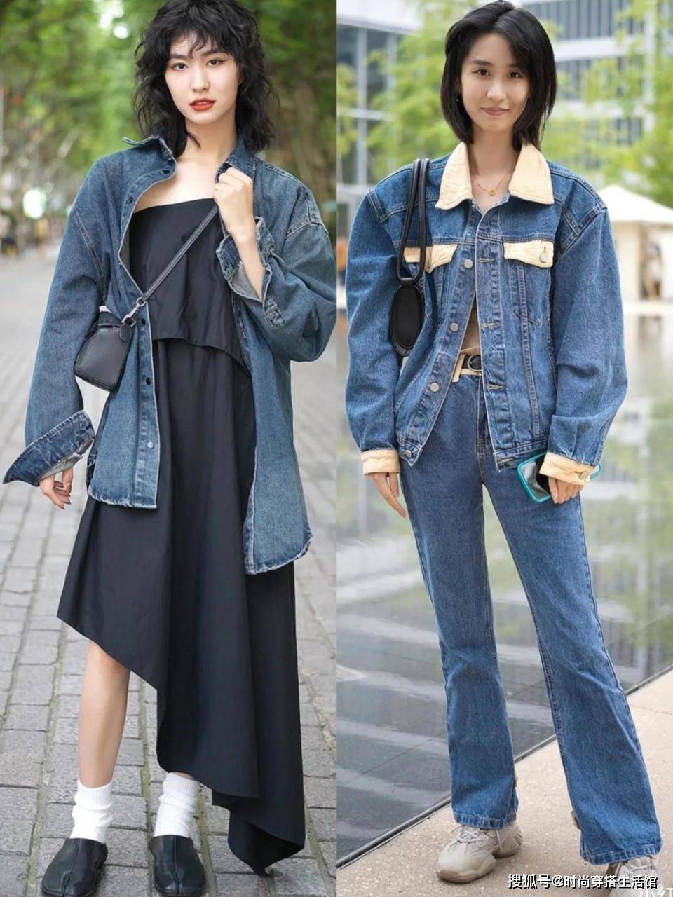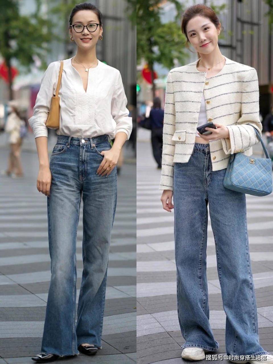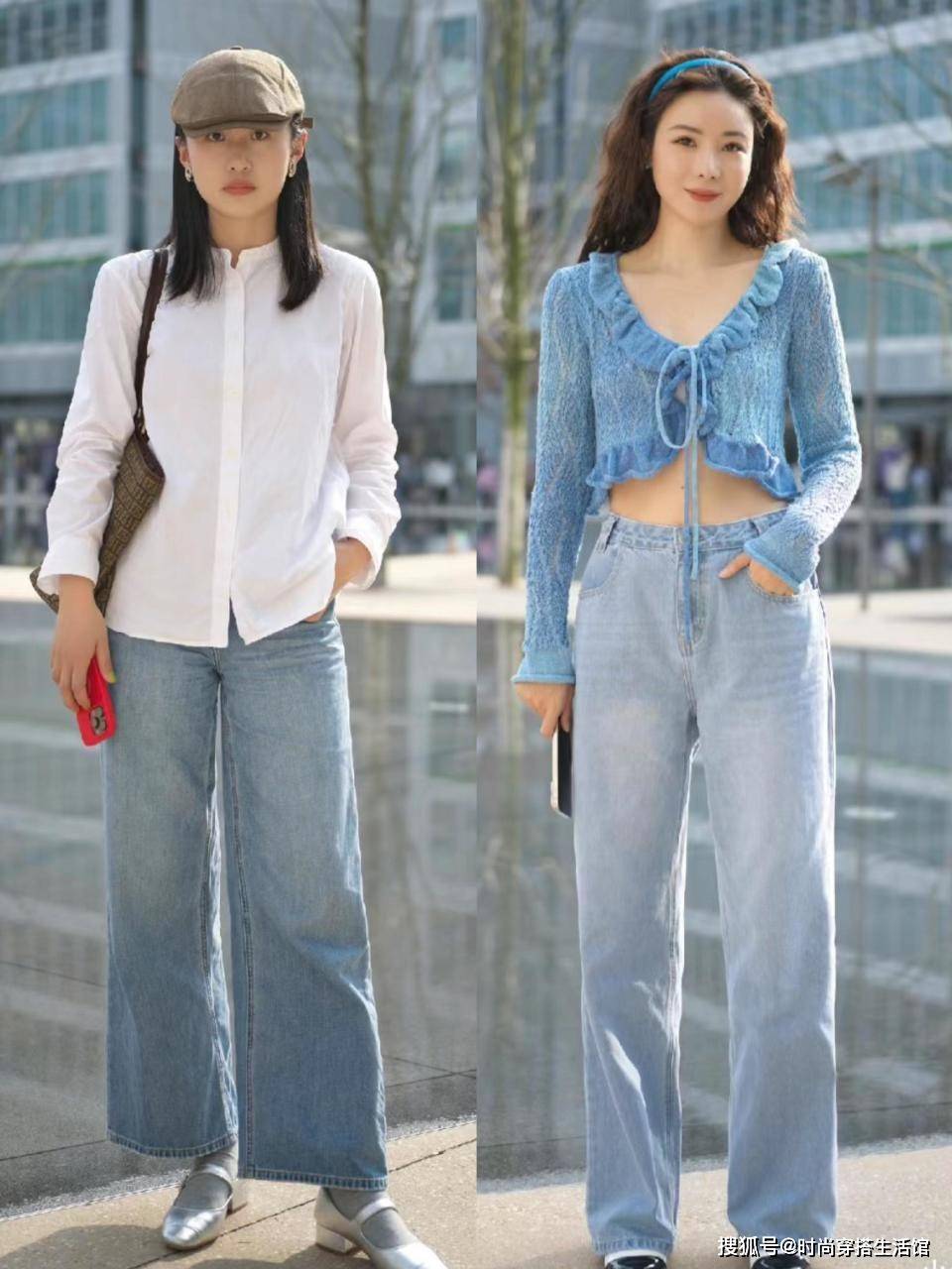 - 街拍:牛仔裤好看又百搭,搭配一字肩上衣很经典,百搭时尚