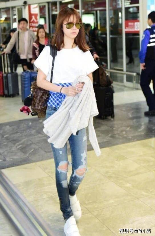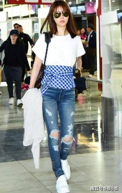 — 林心如又带火了一种新穿法:条纹T恤+牛仔裤+平底鞋,洋气又减龄 —