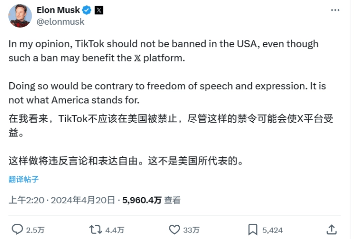 — 马斯克发文:禁止TikTok与美国所代表的言论自由相悖 尽管他可能会因此获益 —