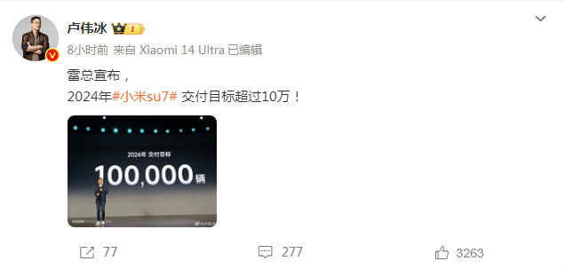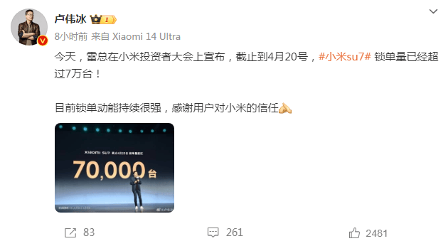 — 雷军透露:小米SU7锁单超7万 今年目标10万台 —