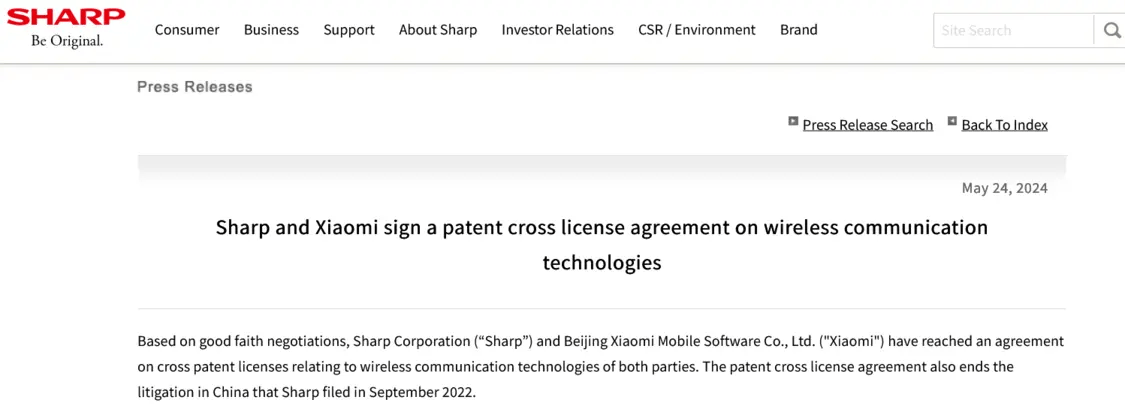 — 结束诉讼 夏普与小米达成无线通信专利交叉许可协议 —