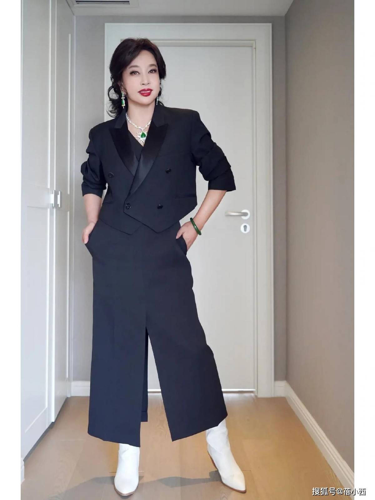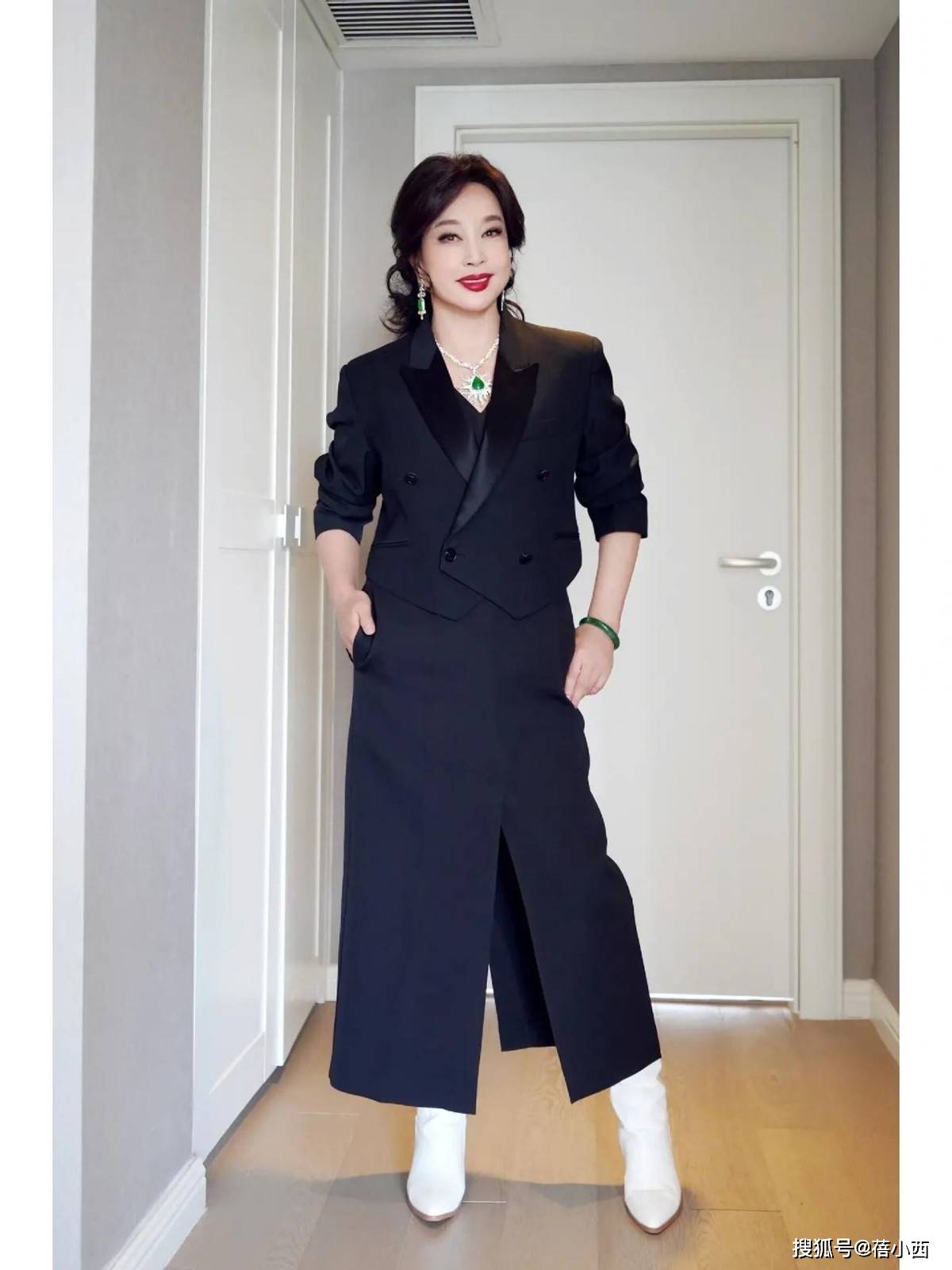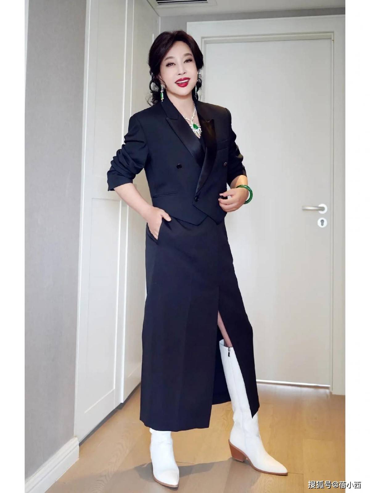 — 又被刘晓庆惊艳到!穿短西装+小黑裙+长筒靴亮相,贵妇气质太明显 —