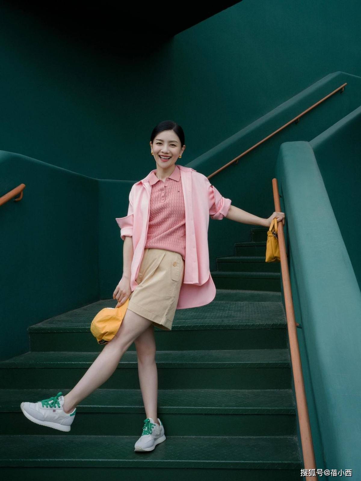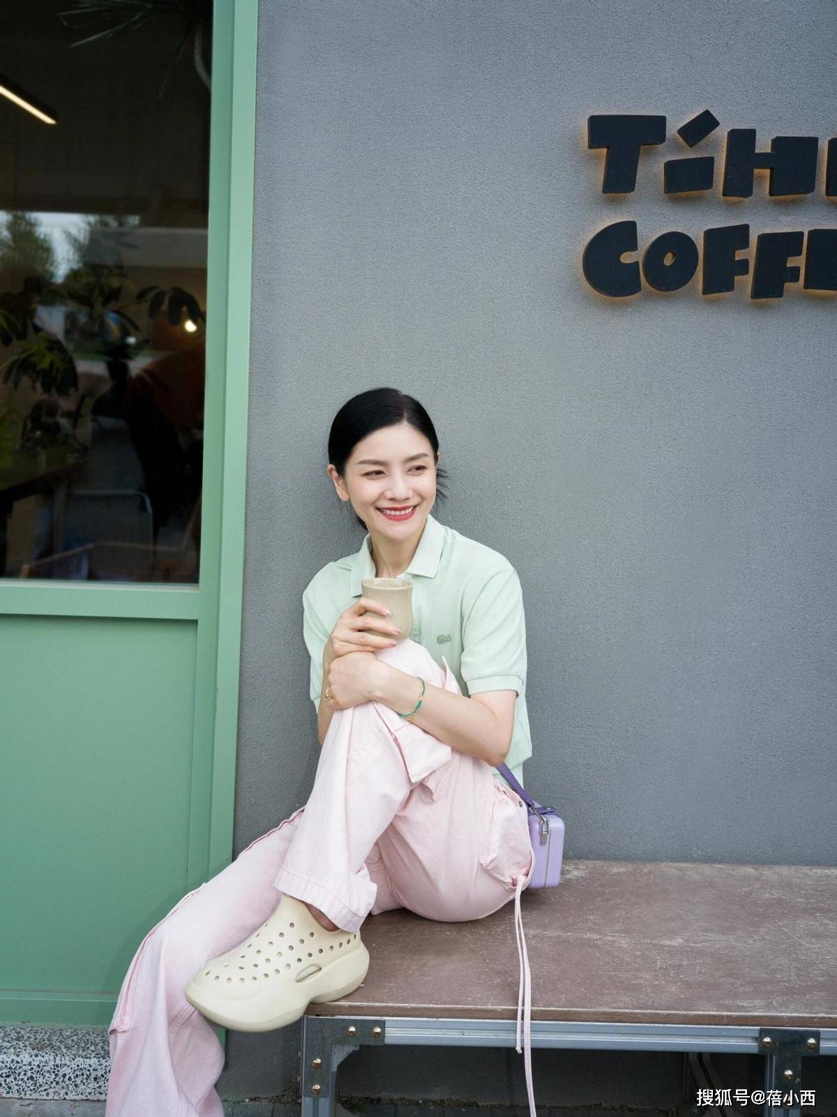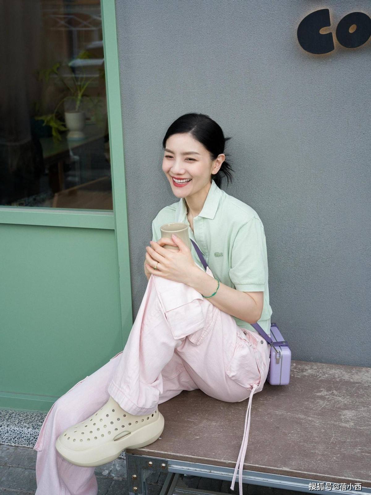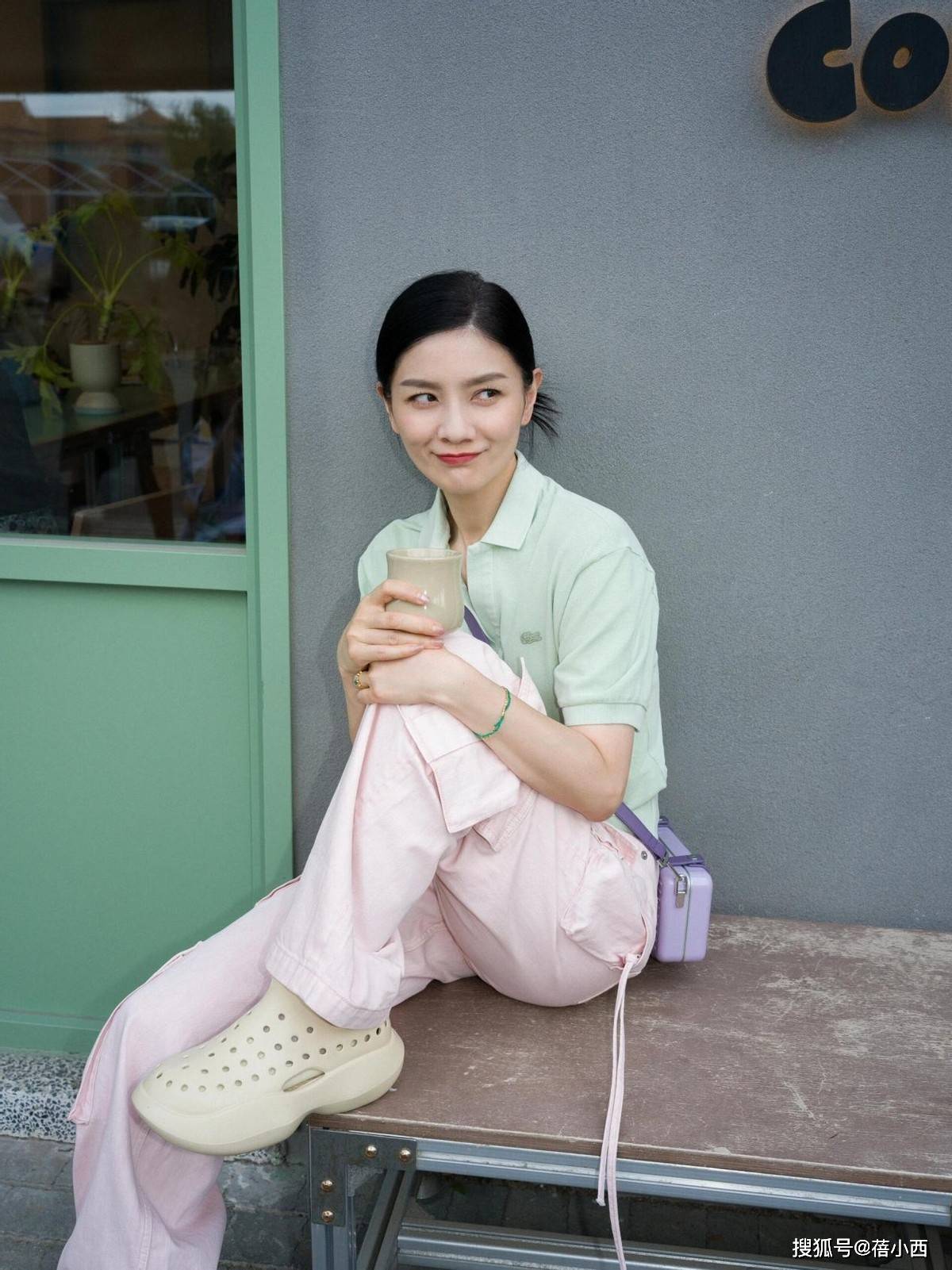 — 48岁胡可带火了一种新穿法:绿上衣+粉裤子+洞洞鞋,洋气又减龄 —