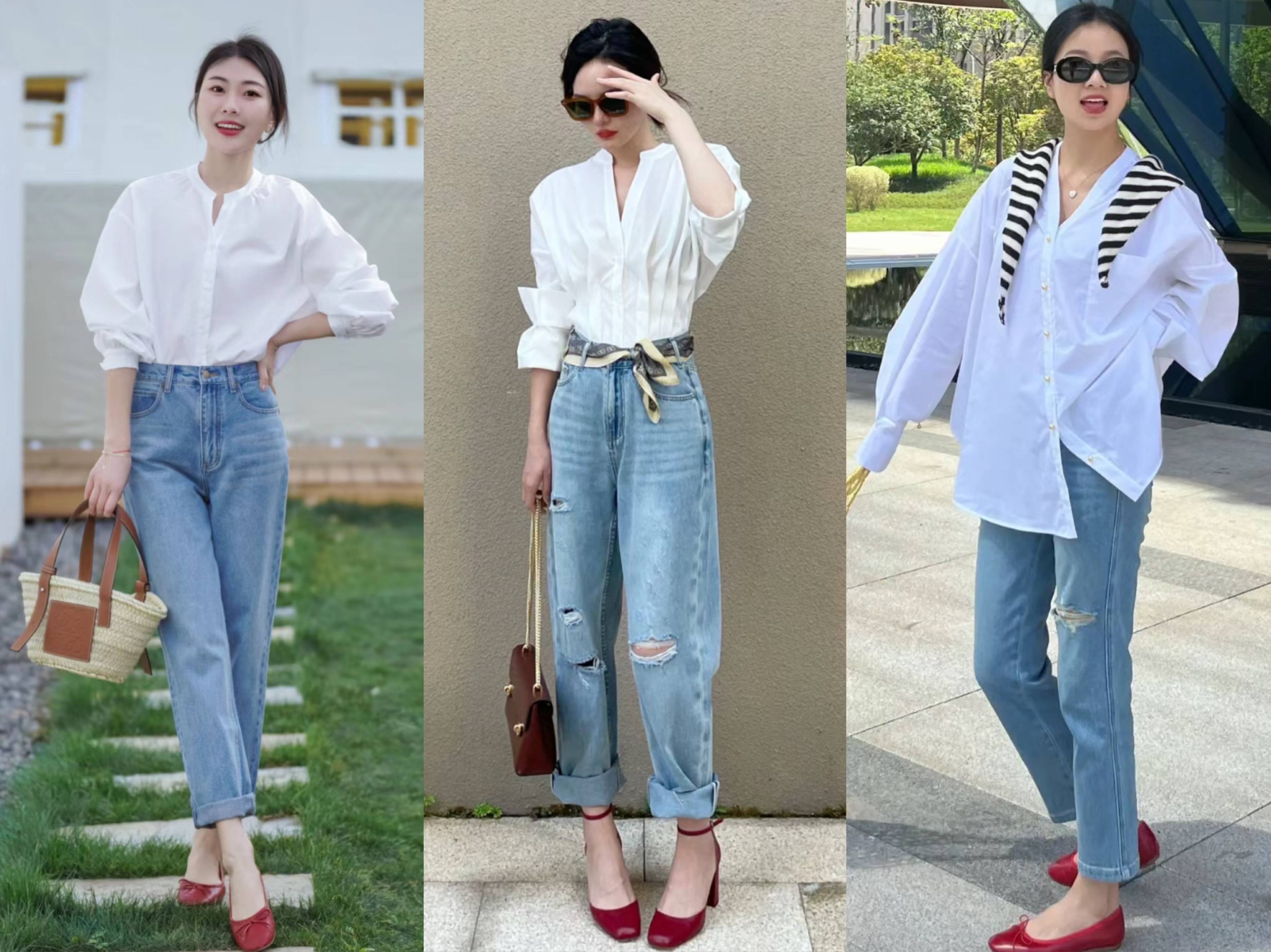 - 街拍:牛仔裤好看又百搭,搭配一字肩上衣很经典,百搭时尚