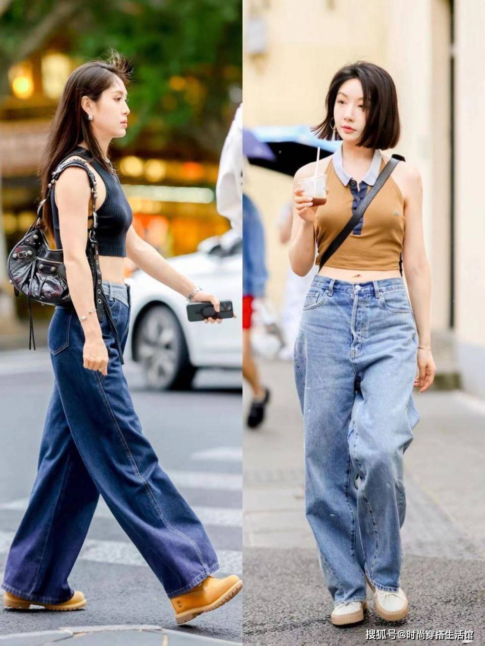 - 街拍:牛仔裤好看又百搭,搭配一字肩上衣很经典,百搭时尚