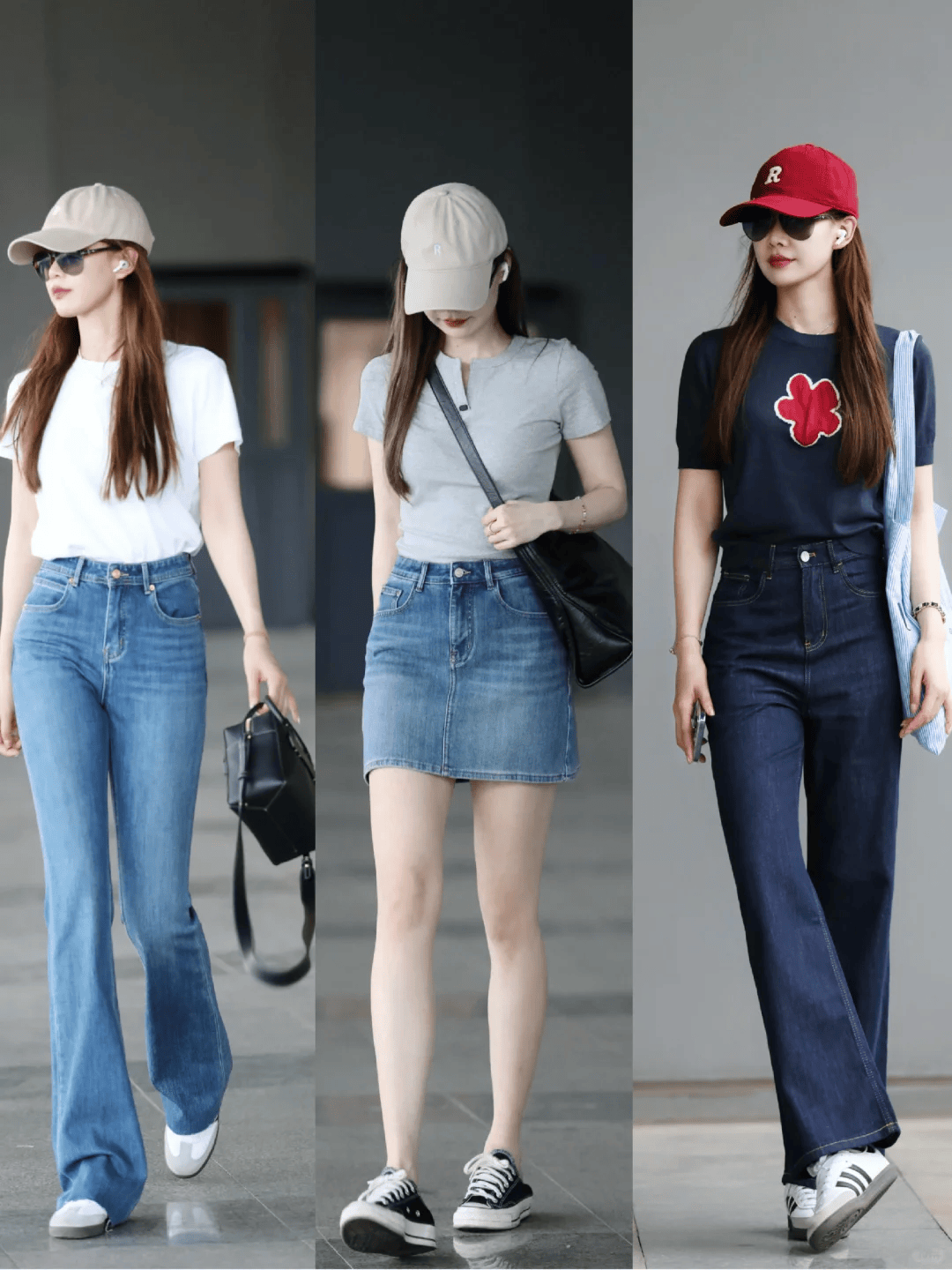 - 街拍:牛仔裤好看又百搭,搭配一字肩上衣很经典,百搭时尚