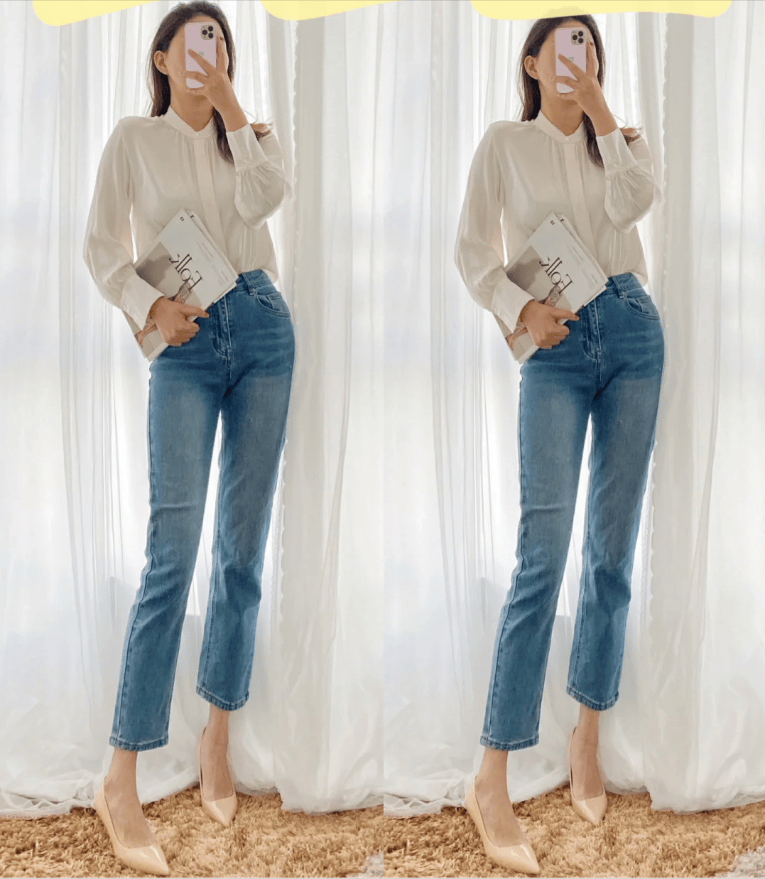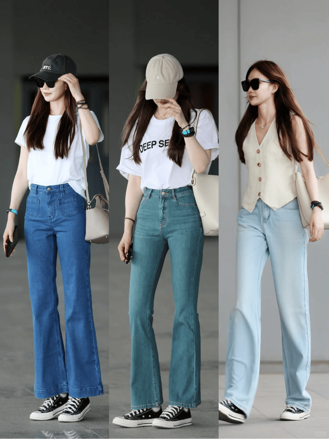 - 街拍:牛仔裤好看又百搭,搭配一字肩上衣很经典,百搭时尚