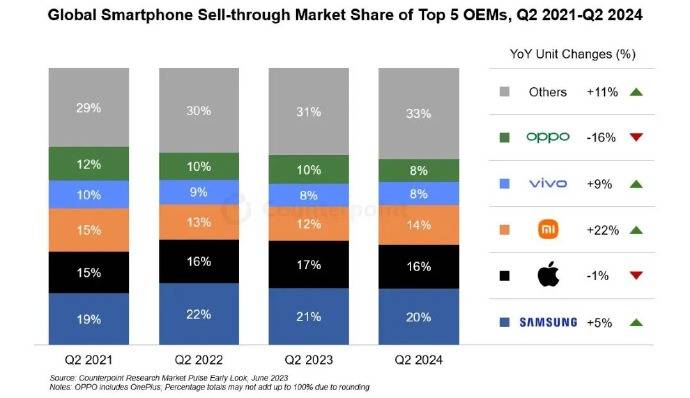 — 2024年Q2全球智能手机销量公布:三星、苹果、小米前三 —