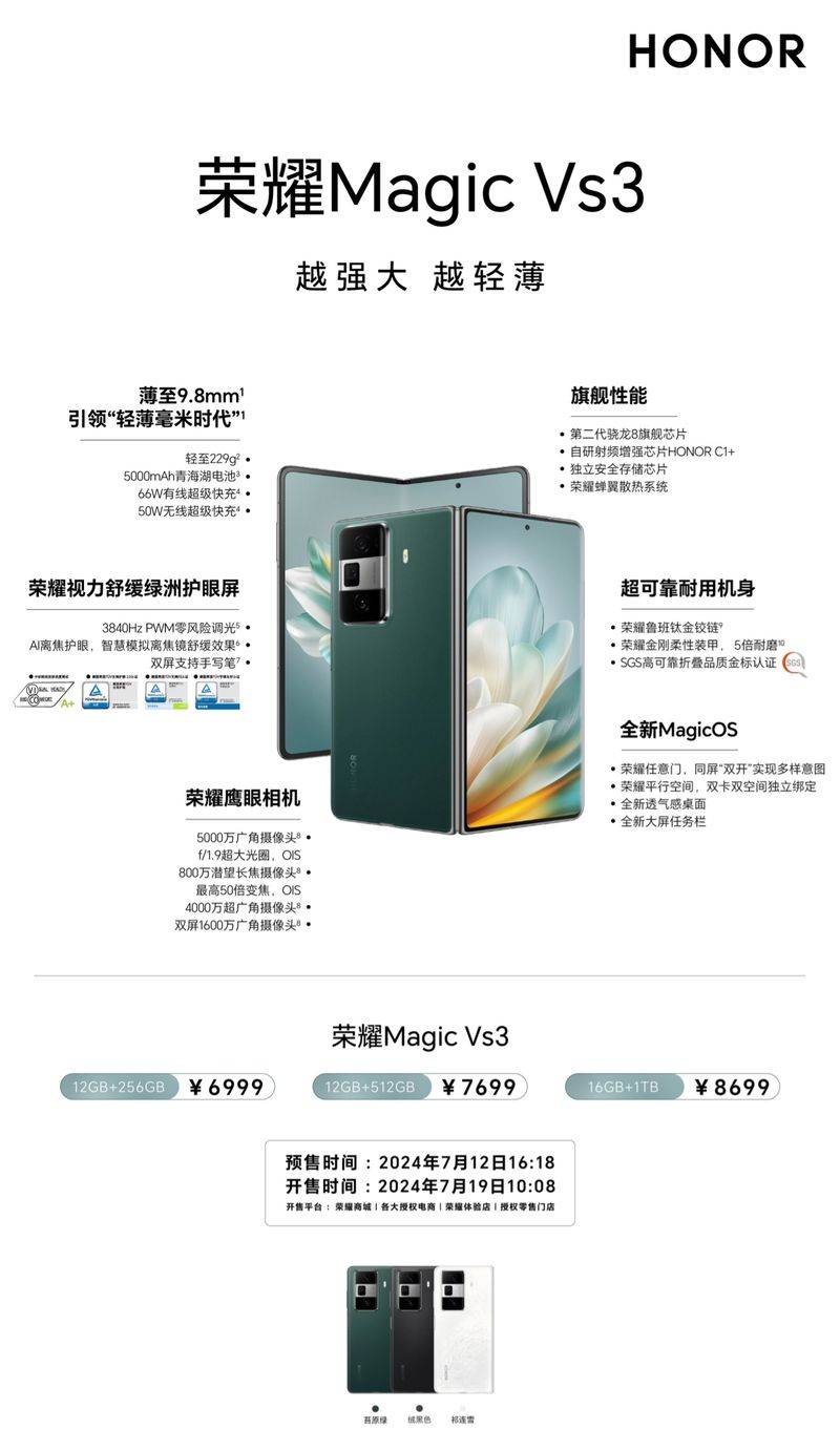 — 荣耀Magic Vs3折叠屏手机6999元起 双卡双空间独立绑定 —