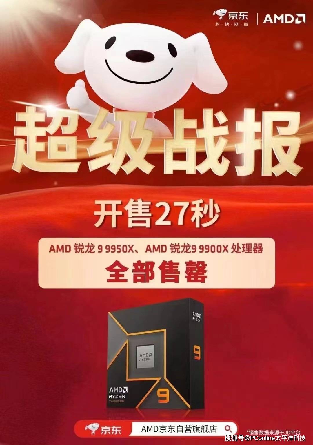 — 开售27秒售罄 京东AMD锐龙9 9950X/AMD锐龙9 9900X 受消费者热捧 —