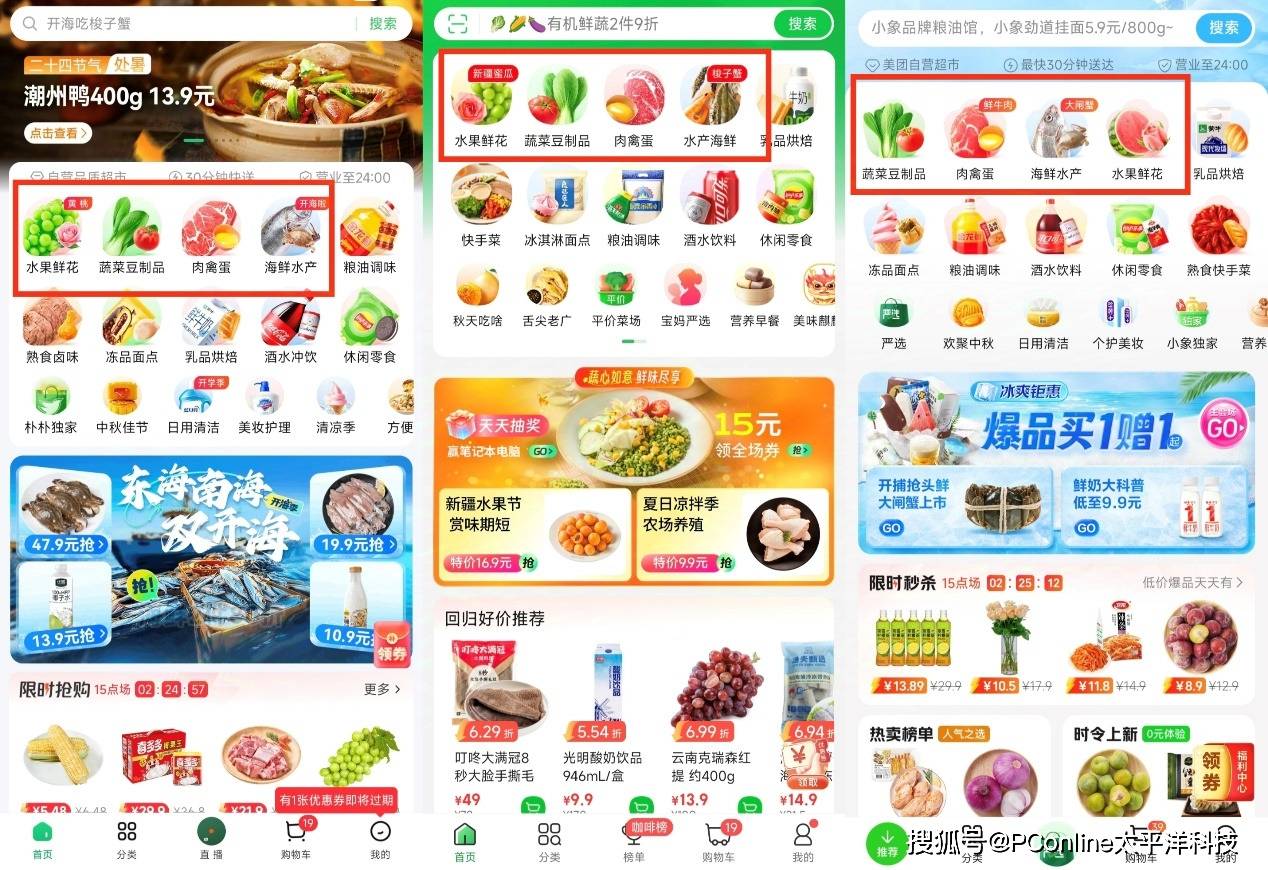 从左到右:朴朴、叮咚、小象超市各大APP中,生鲜类目都在显眼的首排位置