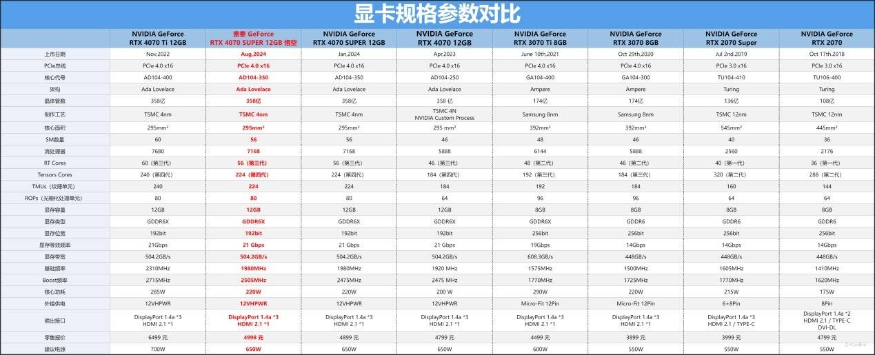 虽然索泰GeForce RTX 4070 SUPER 12GB悟空上的也是AD104核心,但是代号其实是AD104-350。不过它的规格相比RTX 4070有了“质的飞跃”,首先变化最明显的就是CUDA,核心数量也从5888个增加至7168个,增幅高达21.7%,这也是三款SUPER显卡里涨幅最大的。
