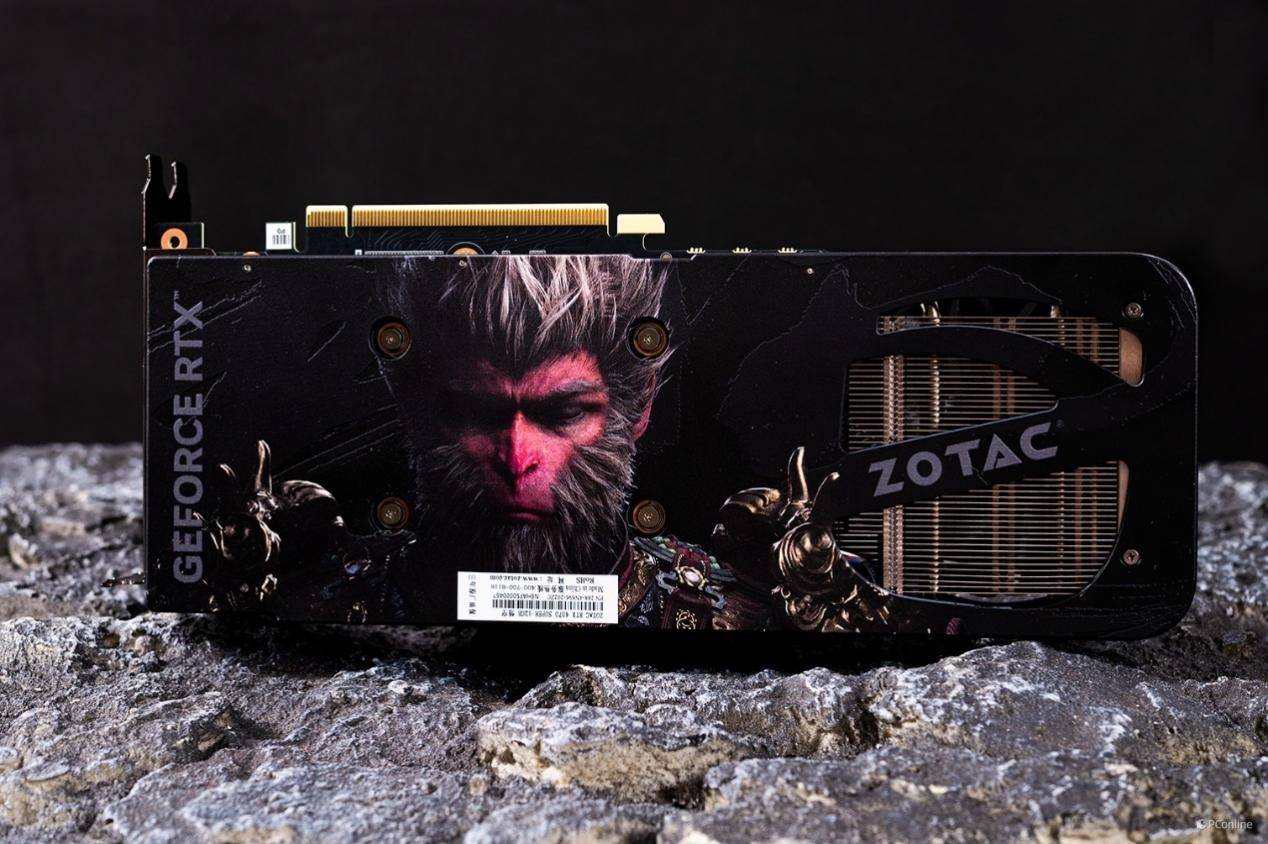 显卡本身就更精致了,索泰对这张显卡进行了深度定制,正面的外壳上印有“悟空”LOGO,触感精致细腻,视觉设计前卫。暗黑色的外观设计不仅点出了《黑神话:悟空》,还让整张显卡充满电竞气息。