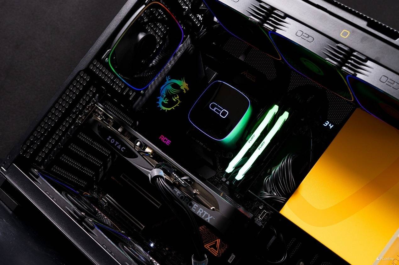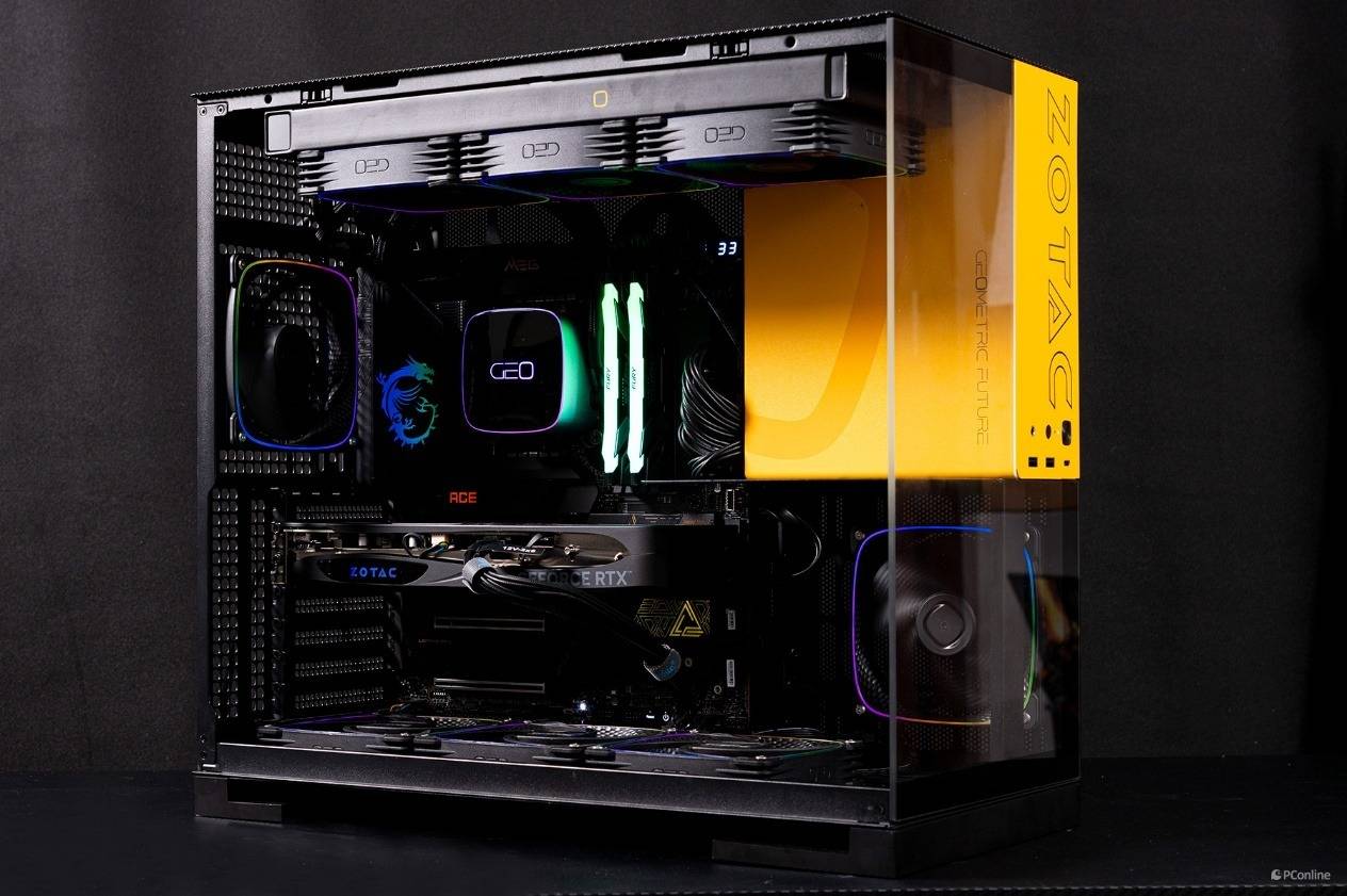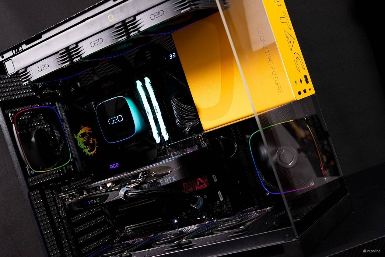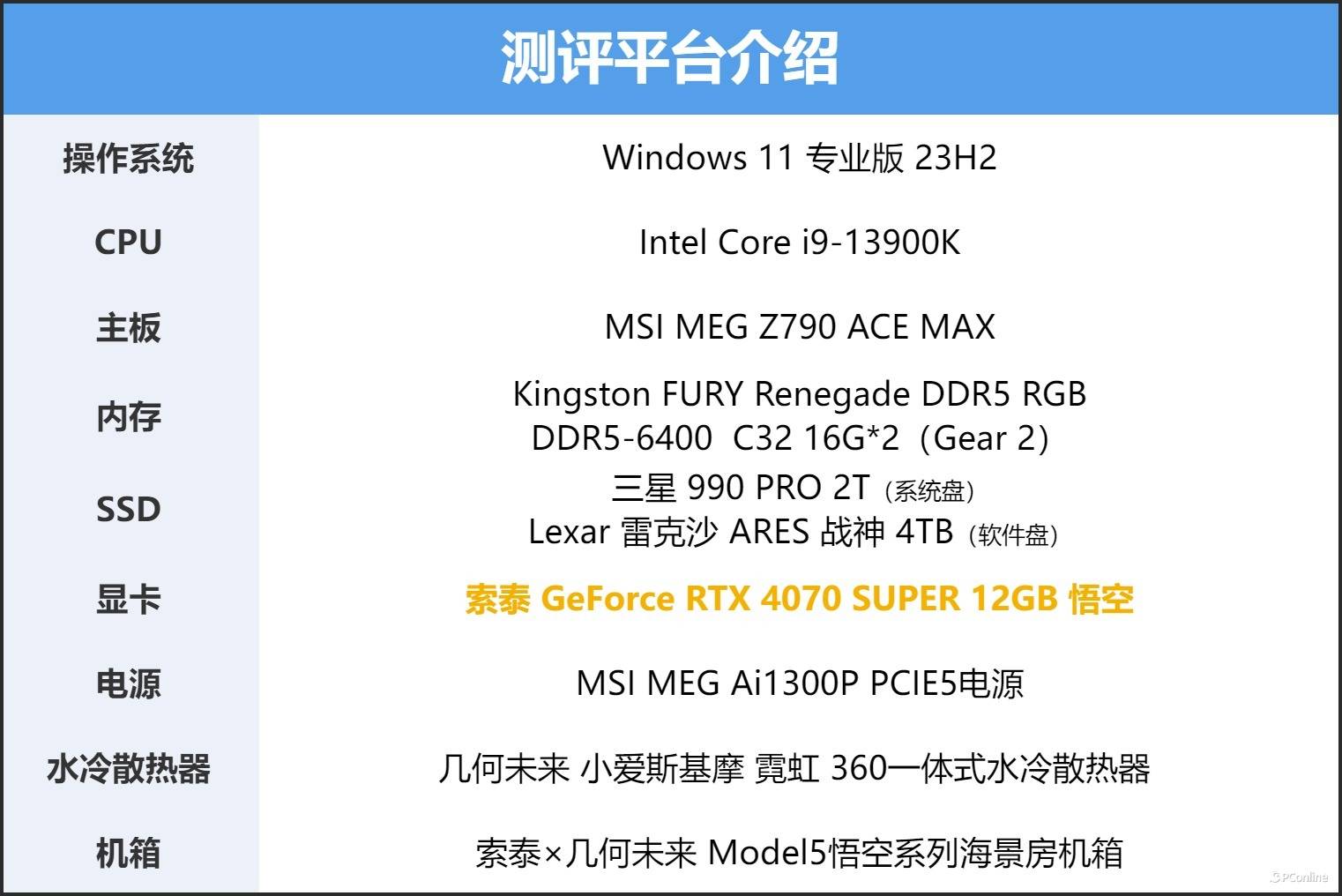 拆解完成,接下来就是性能测试了,不过开始前照例介绍一下这次的测试平台。我们用的是以索泰GeForce RTX 4070 SUPER 12GB 悟空显卡打造的性能PC进行测试。机箱是索泰×几何未来联合定制的M5悟空海景房机箱。处理器用的是i9-13900K,搭配几何未来小爱斯基摩纯白360一体式水冷散热器强劲释放。
