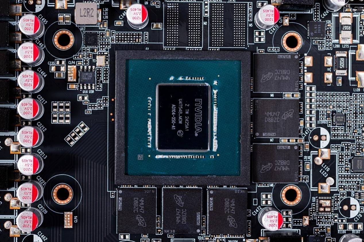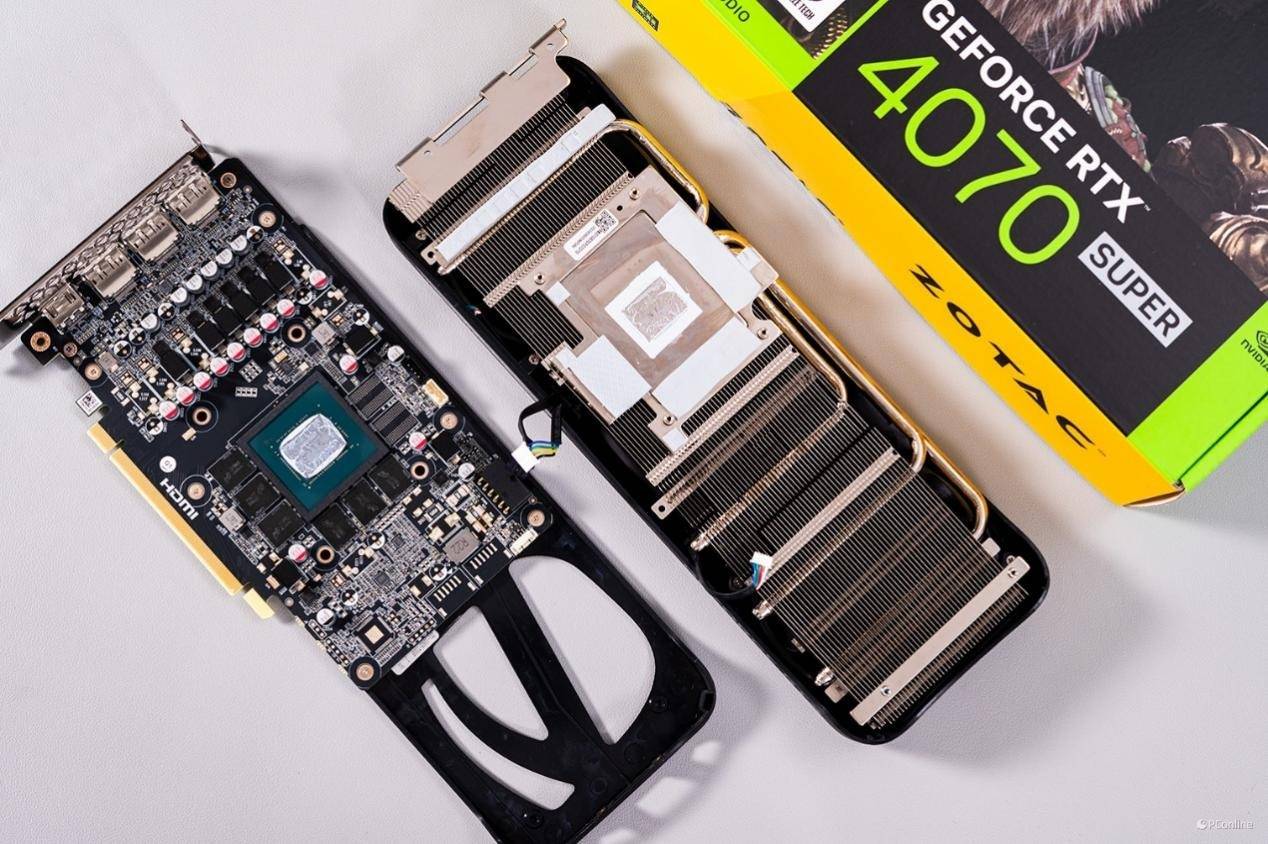 PCB的正中间就是这张显卡的核心了,索泰GeForce RTX 4070 SUPER 12GB 悟空显卡搭载的是AD104-350-A1,这颗核心采用TSMC 4N工艺打造,295mm2的芯片面积内塞下了7168个CUDA 核心,同时内部还有56个第三代RTX Cores,224个第四代Tensor Cores以及48MB的L2缓存,性能强劲不言而喻。