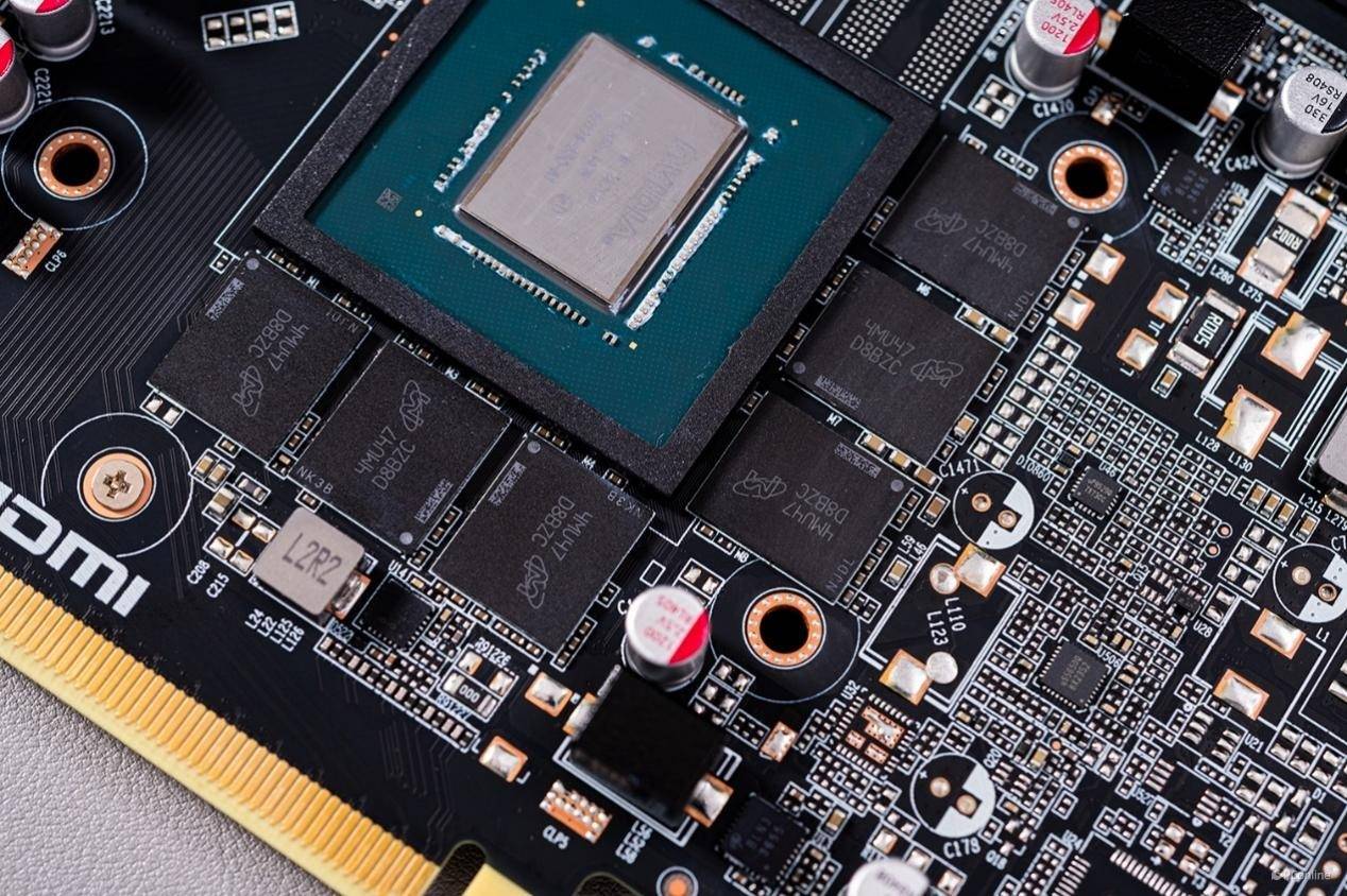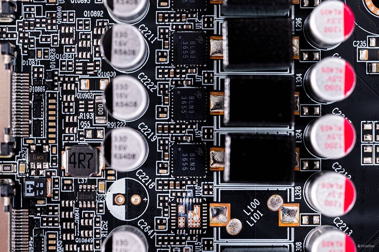 供电规模方面,这张显卡用的是7+2相供电设计,其中7相为核心供电,剩余的2相为显存供电,四周还有固态电感坐镇,可有效减少电流啸叫。
