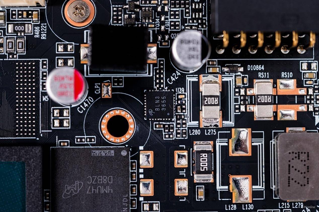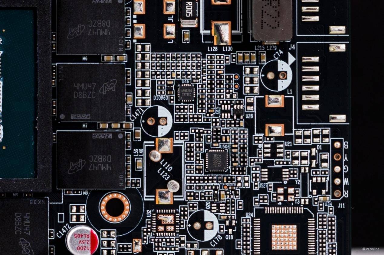 PCB相当紧致,整块PCB采用的是紧凑的短板型设计,面积仅有整个散热模组的一半左右。PCB上各个功能电路区域的设计非常清晰明了,电子元器件的布局也相当规整。