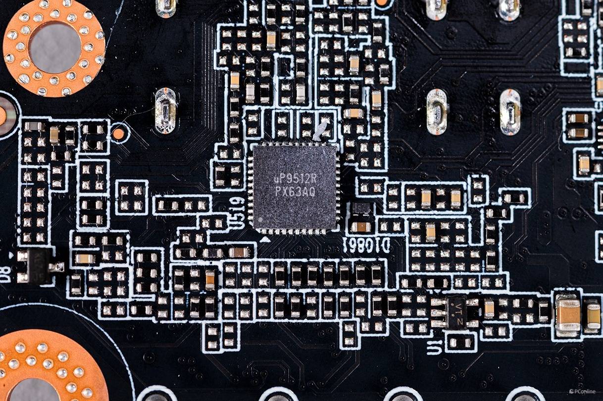 核心PWM配置在PC背面,具体型号为uPI uP9512R,显存PWM配置在PCB正面,具体型号为uPI uP9529Q,另外PCB正面还有一颗uPI uS5650Q用作电源监控。