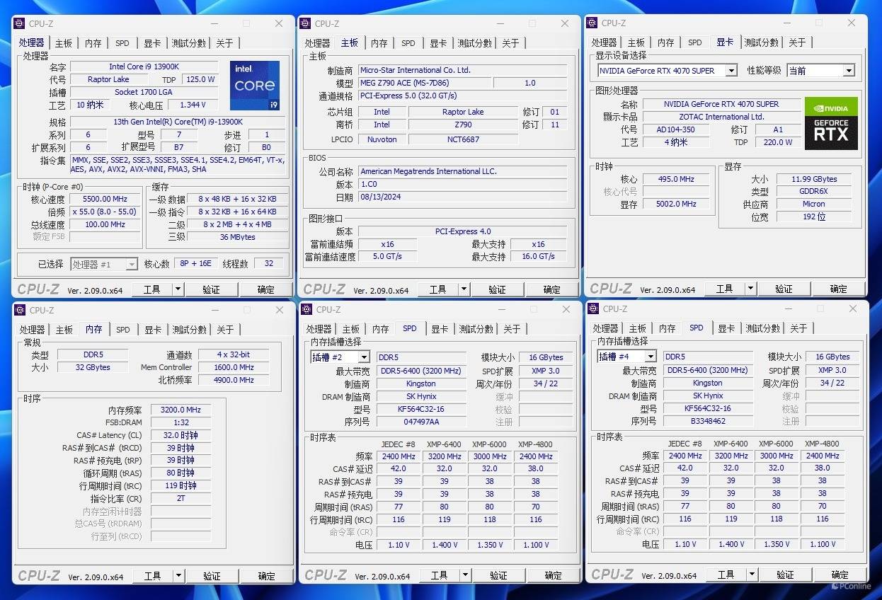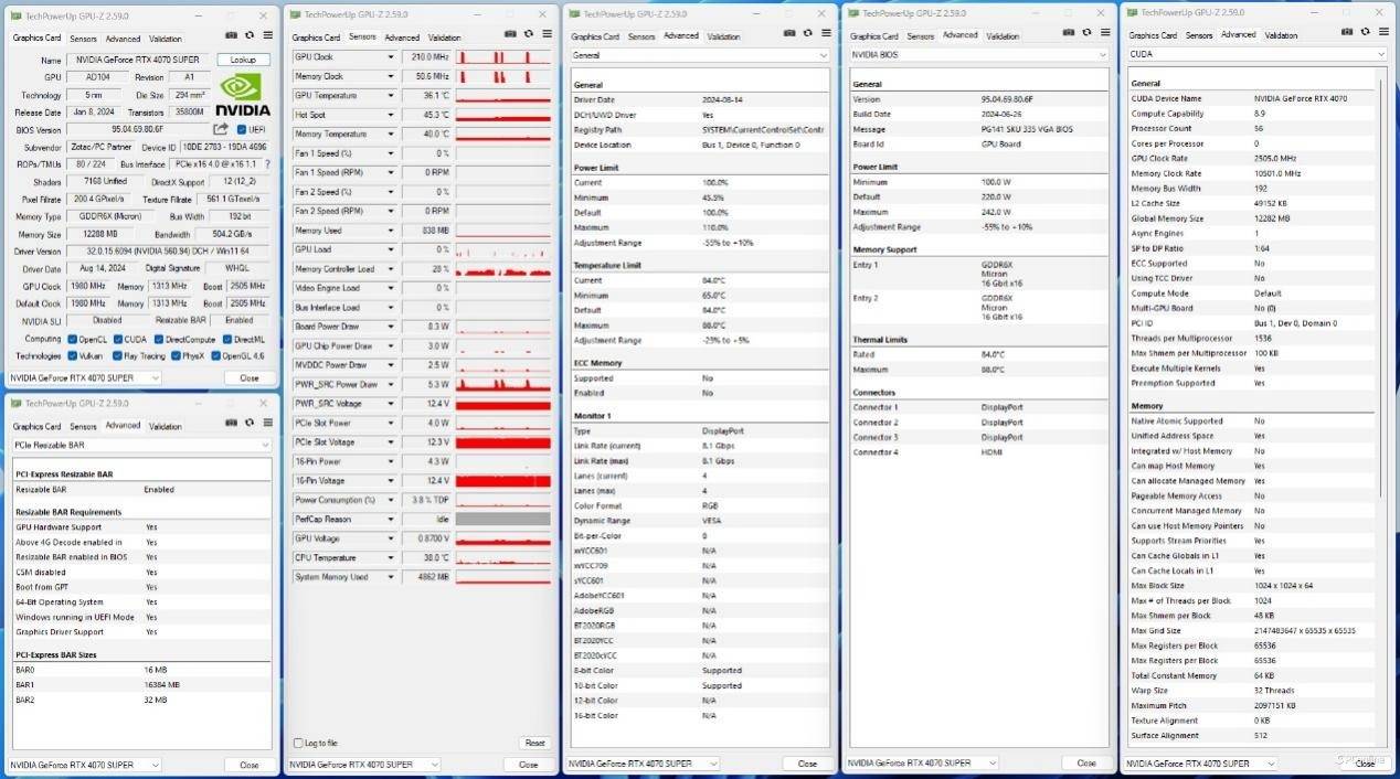 启动!我们可以现在CPU-Z与GPU-Z这两款软件中对整套硬件平台有一个基本的了解。从下图中可以看到索泰GeForce RTX 4070 SUPER 12GB悟空显卡搭载的是AD104-350核心,包含7168个CUDA核心,显存则是12GB的GDDR6X,与拆解一致。