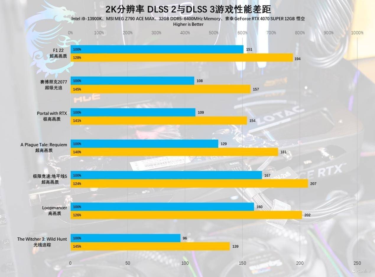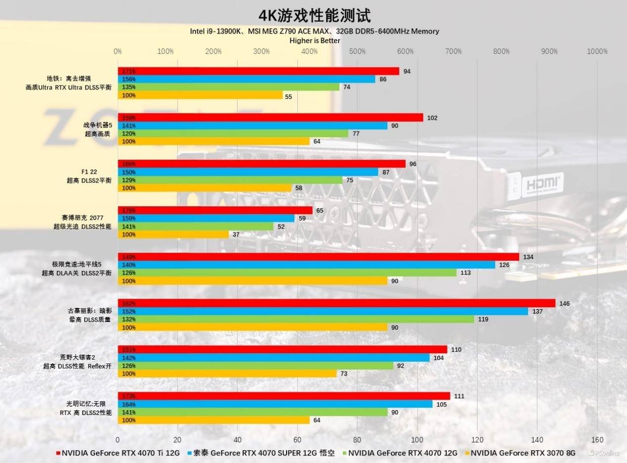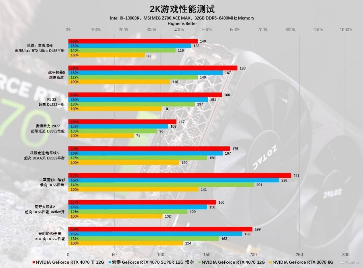 理论性能不错,那实际游戏表现又真的如理论表现那么优秀吗?这里我们用2K与4K两种分辨率对其进行测试。在DLSS 2下,索泰GeForce RTX 4070 SUPER 12GB 悟空显卡的表现已经相当出色了,大部分游戏光靠DLSS 2就能实现高刷体验,并且性能表现领先RTX 4070高达10%以上。