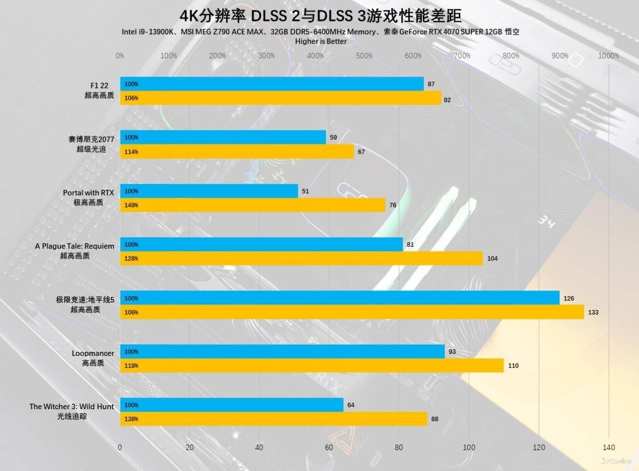4K就更不用说了,刚刚还徘徊在60 FPS附近的赛博朋克2077,现在有了DLSS 3的加持以后,索泰GeForce RTX 4070 SUPER 12GB 悟空显卡也能流畅运行了。并且大部分游戏在DLSS 3的加持下,游戏帧数都有不同程度的提升,最大的涨幅能够来到38%左右,相当夸张。