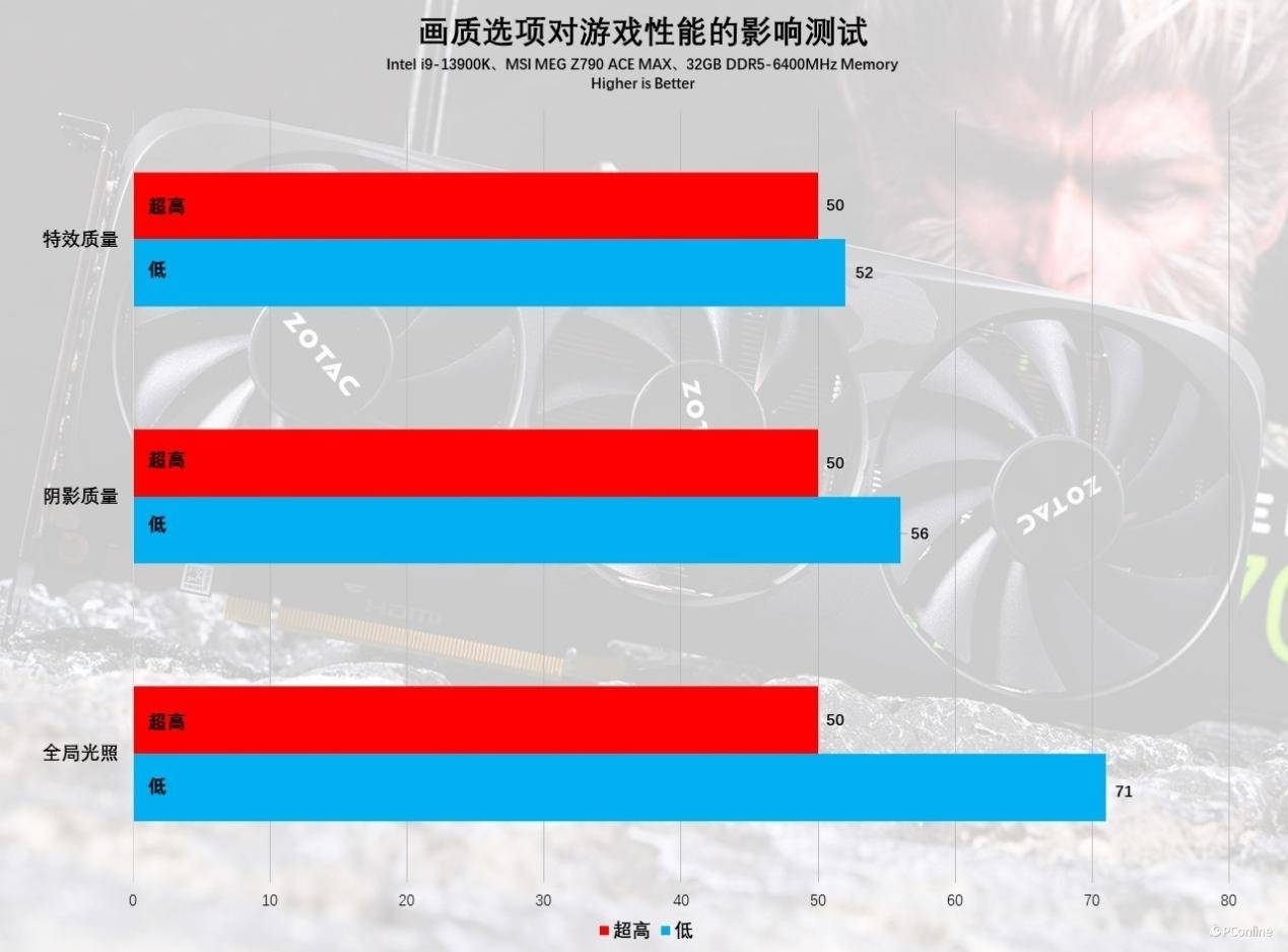 在这十项参数里,有3个选项对游戏帧数有着显著影响,实测数据如下,我们都是用索泰GeForce RTX 4070 SUPER 12GB悟空进行测试,为了看出不同设置明显的区别,我们只在2K画质下测试影视级画质与低画质两档,按照影响程度排名如下1.全局光照 2.阴影质量 3.特效质量。至于其他画质选项,经过实测,由于它们对系统帧数的影响较小,同时开启超高选项确实能为整体画面效果增色不少,并且帧数也几乎没有变化。
